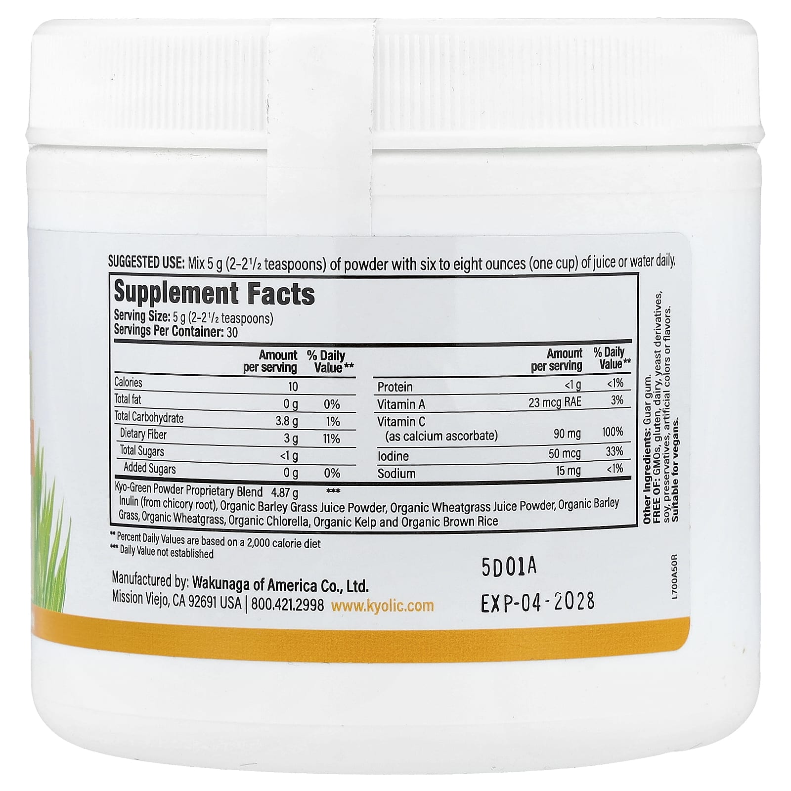 A Mistura para Bebida em Pó com Verduras Kyo-Green® contém uma mistura única de superalimentos orgânicos e de origem natural que fornecem benefícios nutricionais equilibrados para todo o corpo. A grama de cevada e a grama de trigo reforçam o sistema imunológico do corpo e podem ajudar a manter a energia. O arroz integral e a inulina (da raiz de chicória) contribuem para uma digestão saudável. A composição nutricional exclusiva de chlorella e algas marinhas contribui para a saúde do coração.