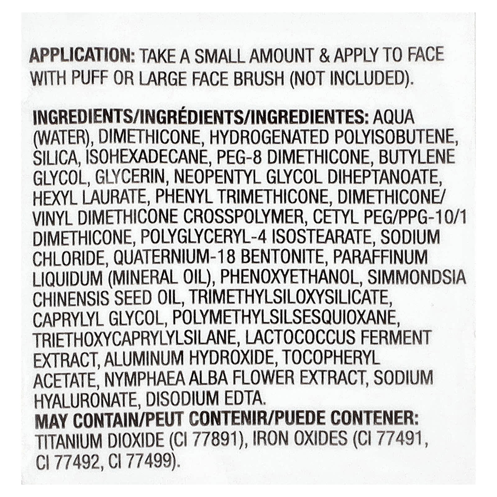 Aqua (água), dimeticona, poliisobuteno hidrogenado, sílica, isohexadecane, peg-8 dimethicone, butilenoglicol, glicerina, neopentyl glycol diheptanoate, hexyl laurate, phenyl trimethicone, dimethicone/ vinyl, crospolímero de dimeticona, cetyl peg/ppg-10/1 dimethicone, polyglyceryl-4 isostearate, cloreto de sódio, quaternium-18 bentonita, Paraffinum liquidum (óleo mineral), fenoxietanol, óleo da semente de Simmondsia chinensis, trimethylsiloxysilicate, caprylyl glycol, polymethylsilsesquioxane, triethoxycaprylylsilane, extrato da fermentação de Lactococcus, hidróxido de alumínio, acetato de tocoferol, extrato da flor de Nymphaea alba, hialuronato de sódio, edetato dissódico. Pode conter: dióxido de titânio (CI 77891), óxidos de ferro (CI 77491, ci 77492, CI 77499).