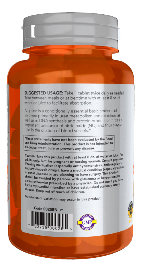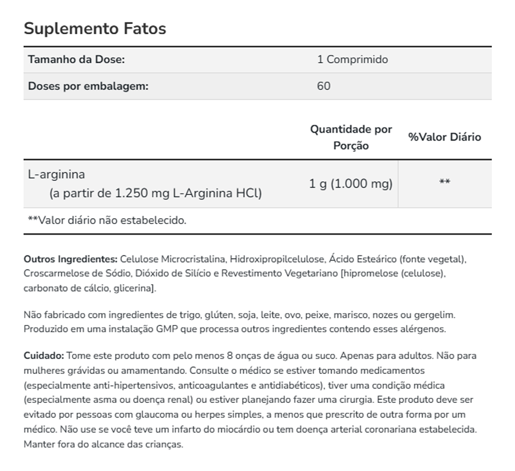 Cada tablete contém 1000mg de L-Arginina, fornecendo uma dose conveniente e prática para consumo diário.