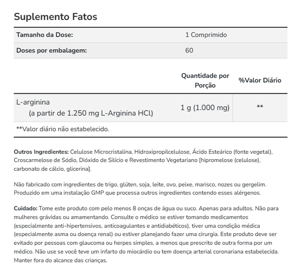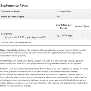 Cada tablete contém 1000mg de L-Arginina, fornecendo uma dose conveniente e prática para consumo diário.