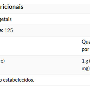 Outros Ingredientes: Hipromelose (cápsula de celulose), Ácido Esteárico (fonte vegetal) e Dióxido de Silício. Não é fabricado com ingredientes de trigo, glúten, soja, leite, ovo, peixe, marisco ou nozes;