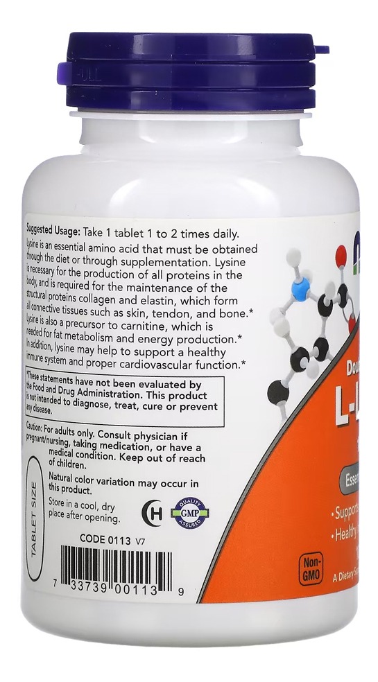 L Lisina Dupla Força 1000mg Now Foods 100Tab A lisina é um aminoácido essencial que deve ser obtido por meio da dieta ou da suplementação. Necessária para a produção de todas as proteínas do corpo e manutenção das proteínas estruturais colágeno e elastina, que formam todos os tecidos conjuntivos como pele, tendão e osso. Também é um precursor da carnitina, que é necessária para o metabolismo da gordura e produção de energia. Outros ingredientes: celulose microcristalina, dióxido de silício, ácido esteárico (origem vegetal), revestimento vegetariano, croscarmelose sódica e estearato de magnésio (origem vegetal). Não contém trigo, glúten, soja, leite, ovo, peixe, marisco ou ingredientes de nozes. Produzido em uma instalação de GMP que processa outros ingredientes contendo esses alérgenos. Apenas para adultos. Consulte um profissional se estiver grávida / amamentando ou se tiver um problema. .