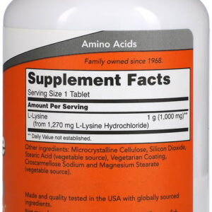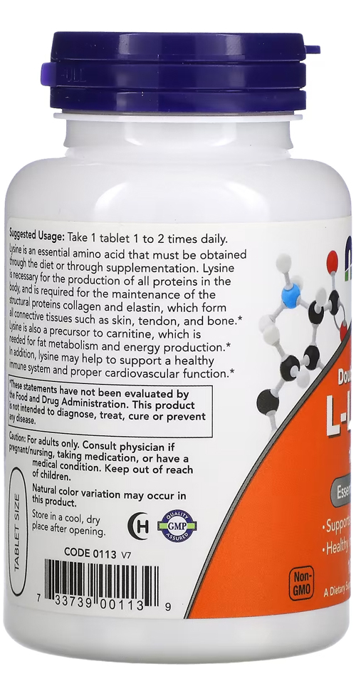 L Lisina Dupla Força 1000mg Now Foods 100Tab A lisina é um aminoácido essencial que deve ser obtido por meio da dieta ou da suplementação. Necessária para a produção de todas as proteínas do corpo e manutenção das proteínas estruturais colágeno e elastina, que formam todos os tecidos conjuntivos como pele, tendão e osso. Também é um precursor da carnitina, que é necessária para o metabolismo da gordura e produção de energia. Outros ingredientes: celulose microcristalina, dióxido de silício, ácido esteárico (origem vegetal), revestimento vegetariano, croscarmelose sódica e estearato de magnésio (origem vegetal). Não contém trigo, glúten, soja, leite, ovo, peixe, marisco ou ingredientes de nozes. Produzido em uma instalação de GMP que processa outros ingredientes contendo esses alérgenos. Apenas para adultos. Consulte um profissional se estiver grávida / amamentando ou se tiver um problema. .