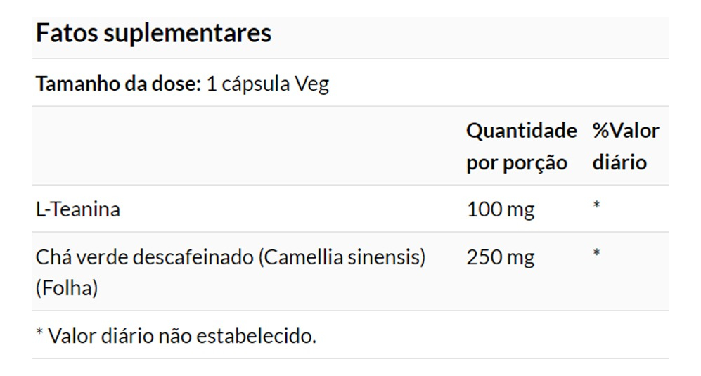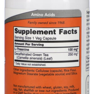 L-Theanine Teanina 100mg Now Foods 90 Veg Caps / Importado Disponível em uma fórmula potente de 100mg e em cápsulas vegetarianas que podem ser facilmente ingeridas e absorvidas pelo organismo, a L-Theanine da Now Foods permite com que você possa complementar sua dieta alimentar com as quantidades necessárias desta substância que é geralmente encontrada nas folhas da planta do chá verde. Uma cápsula por dia é tudo que você precisa. Outros Ingredientes: Hipromelose (cápsula de celulose), Farinha de Arroz, Ácido Esteárico (fonte vegetal) e Dióxido de Silício. Fabricado sem trigo, glúten, soja, leite, ovo, peixe, marisco ou nozes. Recomendação de uso: Tome 1 cápsula 1 a 2 vezes ao dia, conforme necessário, com alimentos. Evitar tomar este produto com o estômago vazio; nunca exceder a dose recomendada. Cuidados: Apenas para adultos. Pessoas com alergia conhecida a mariscos devem evitar usar este produto. Se estiver grávida ou amamentando, busque orientação antes de utilizar este produto. Armazenamento: Armazenar em local fresco e seco após a abertura. Pode ocorrer variação de cor natural neste produto. Mantenha fora do alcance de crianças. Dimensões: 5 x 5 x 10,5 cm Peso: 0,76 1x Frasco com 90 Veg Caps Validade Longa
