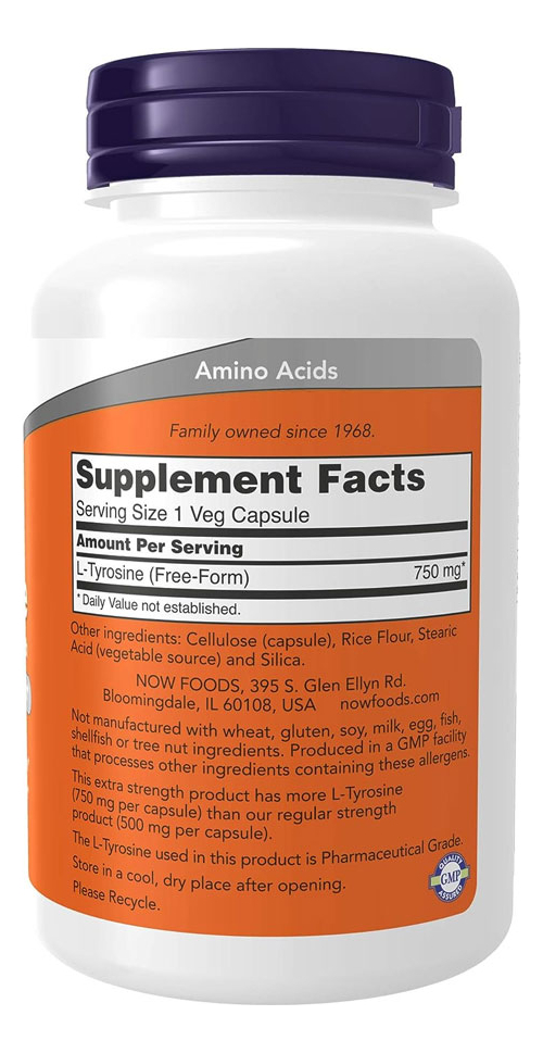 L-tirosina 750mg Now Foods L-Tyrosine Extra Forte 90 Cápsulas Vegetarianas – Importado