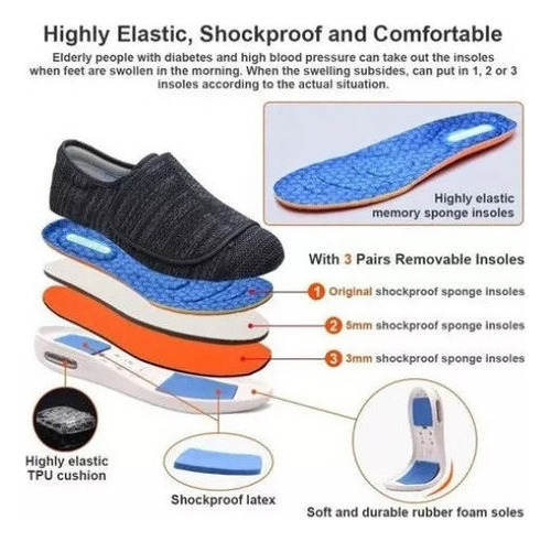 Acompanhamos 1 par de palmilhas originais, 1 par de palmilhas de 5mm e 1 par de palmilhas de 3mm, as palmilhas são macias, confortáveis e a prova de choque, você pode calçar ou descalçar à vontade, os idosos podem tirar os sapatos das palmilhas quando os pés estão inchados, e quando o inchaço diminui, eles podem calçar os sapatos, que são discretos e portáteis.