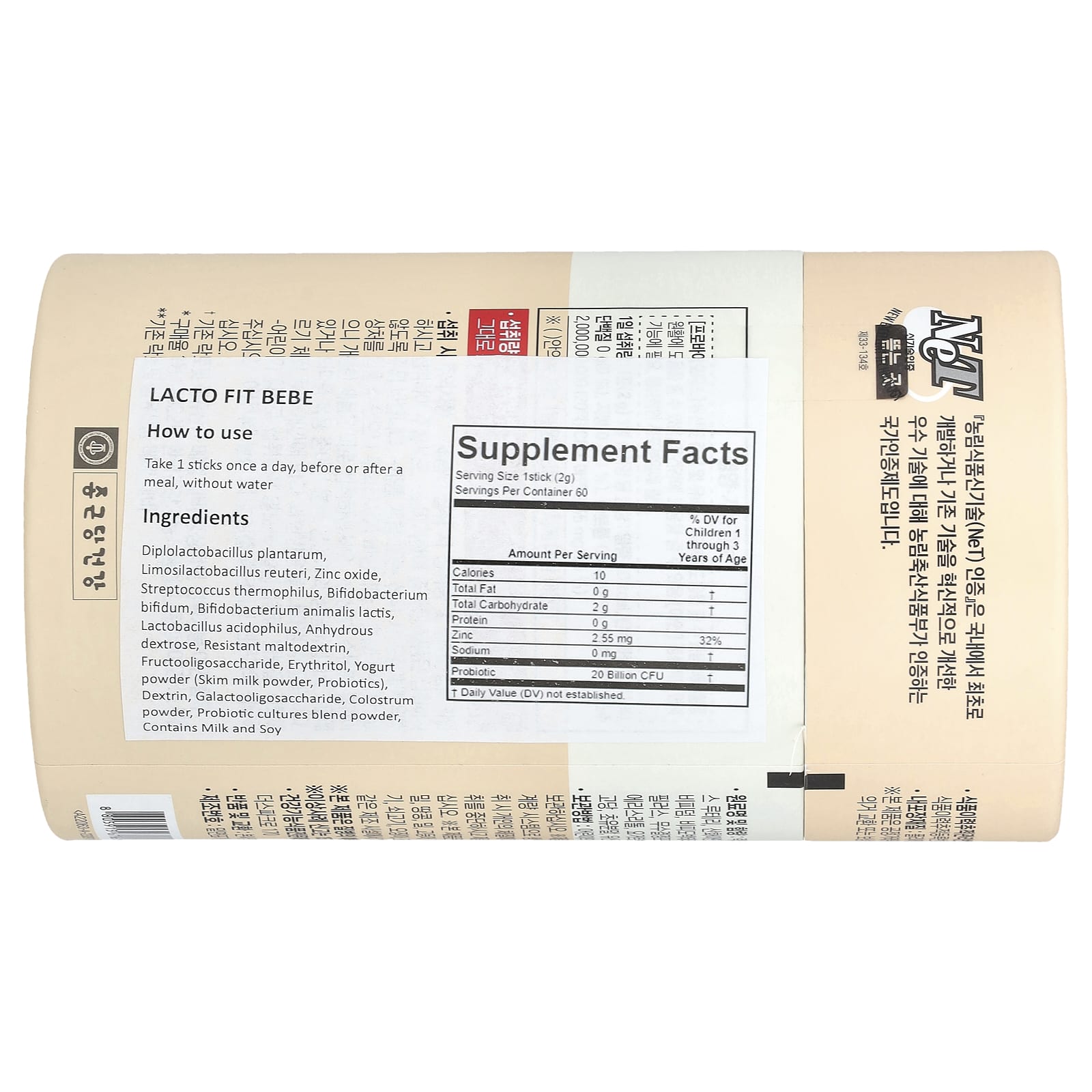Diplolactobacillus plantarum, limosilactobacillus reuteri, óxido de zinco, Streptococcus thermophilus, Bifidobacterium bifidum, Bifidobacterium animalis lactis, Lactobacillus acidophilus, glicose anidra, maltodextrina resistente, fruto-oligossacarídeo, eritritol, iogurte em pó (leite em pó desnatado, probióticos), dextrina, galacto-oligossacarídeos, colostro em pó, mistura de culturas probióticas em pó.