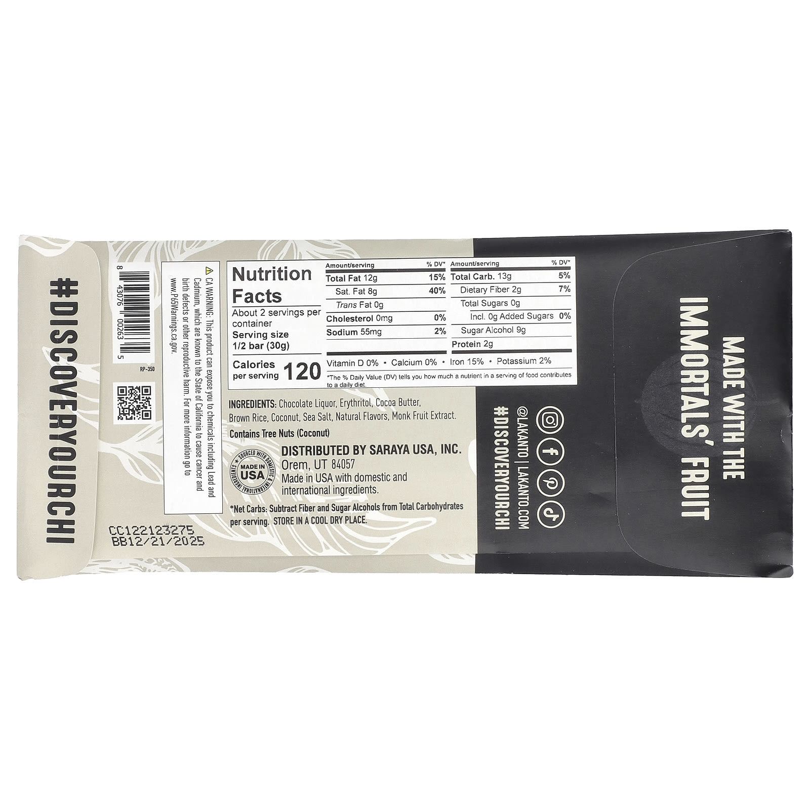 Licor de chocolate, eritritol, manteiga de cacau, arroz integral, coco, sal marinho, sabores naturais, extrato da fruta-dos-monges.