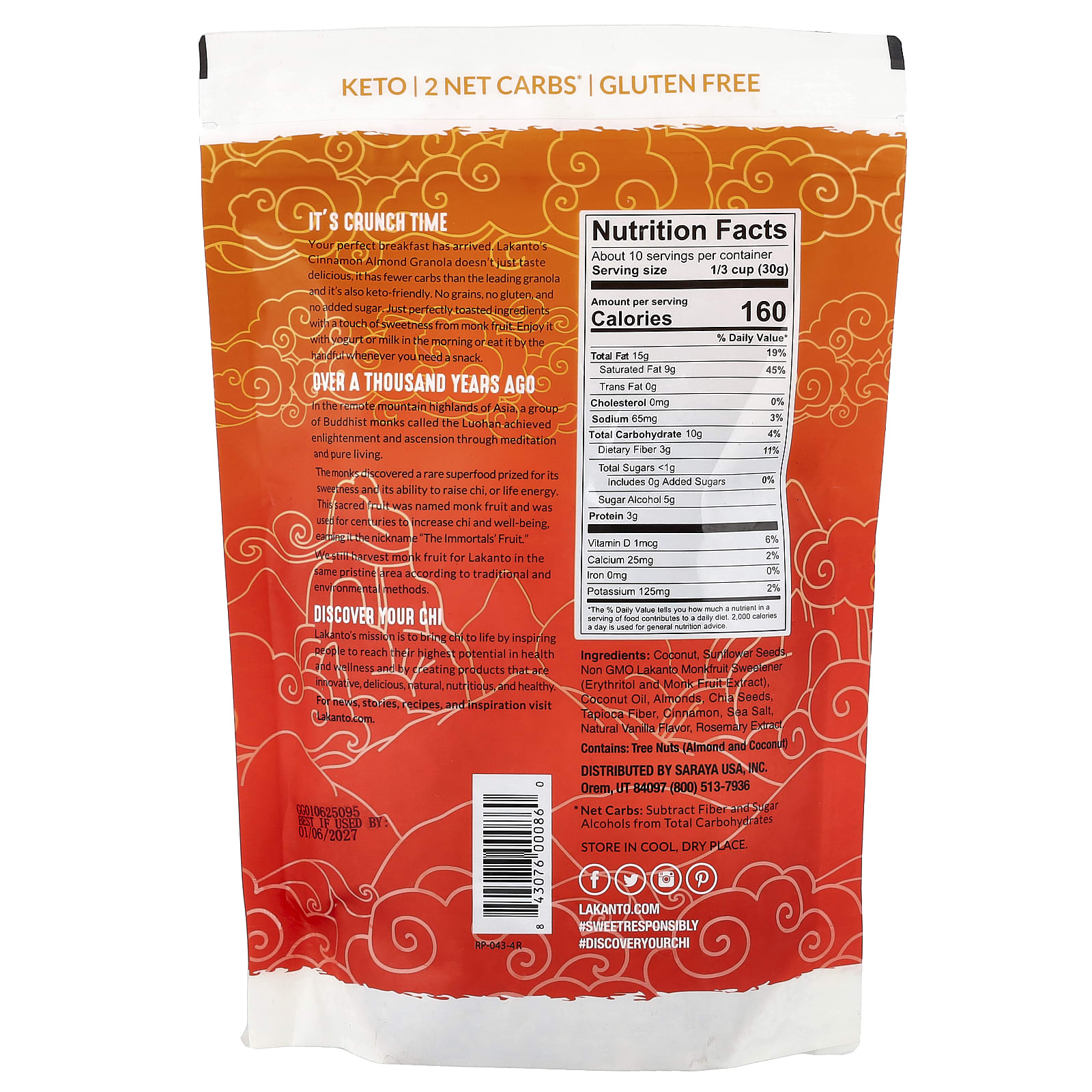 Coco, sementes de girassol, adoçante de siraitia Lakanto não OGM (eritritol e extrato de siraitia), óleo de coco, amêndoas, sementes de chia, fibra de tapioca, canela, sal marinho, sabor natural de baunilha, extrato de alecrim.