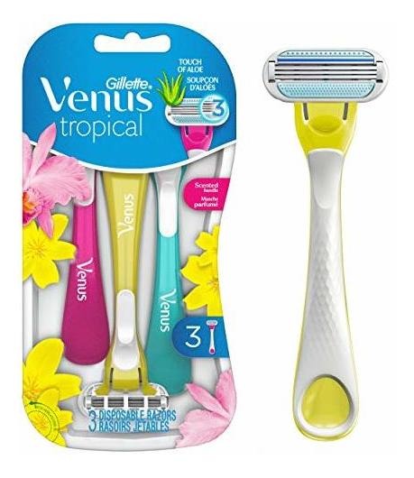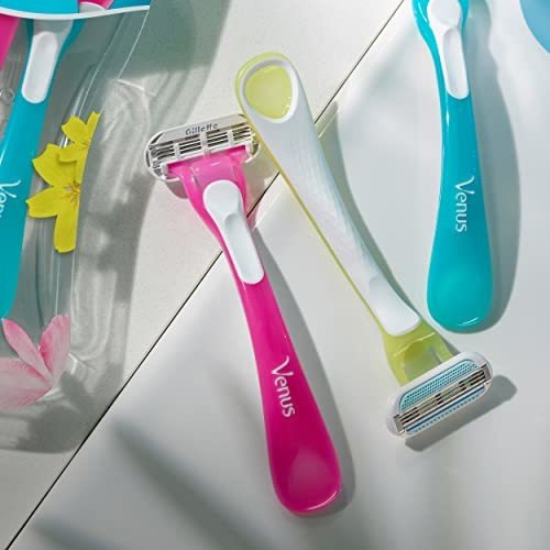 Lâminas de barbear descartáveis Gillette Venus Tropical para mulheres, 3+1 unidades, projetadas para um barbear suave, alças perfumadas com fragrâncias tropicais — Lâminas descartáveis: lâminas de barbear descartáveis femininas Venus Tropical. Sem necessidade de recargas – 3 lâminas: as 3 lâminas e almofadas protetoras desta máquina de barbear proporcionam um barbear suave e preciso com facilidade – ALÇA ERGONÔMICA PERFUMADA: alças multicoloridas com uma fragrância tropical fresca – DESLIZAMENTO CONTÍNUO: essas máquinas de barbear têm uma faixa de lubrificação ativada por água para facilitar o barbear com um movimento fluido e deslizante – DESIGN ADAPTÁVEL: com uma cabeça giratória arredondada que se adapta a os contornos do seu corpo para um barbear suave em áreas difíceis