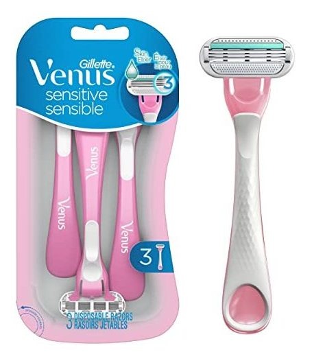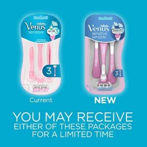 Lâminas de barbear descartáveis femininas Gillette Venus Sensitive — Pacote único de 3 lâminas (a embalagem pode variar) — 3 lâminas: 3 lâminas e uma faixa lubrificante Skin Elixir para deslizar, para proporcionar um barbear suave, com até 0% de irritação (estudo de consumidores dos EUA, fevereiro de 2018) — Faixa rica em umidade com mais lubrificantes para deslizar bem em sua pele sensível versus lâminas de barbear descartáveis Venus originais – 3 lâminas cercadas por almofadas protetoras macias — Cabeça giratória arredondada para caber facilmente em áreas difíceis de barbear — Alça especialmente projetada para ótimo controle — Não é necessário trocar a lâmina de barbear; apenas use e jogue