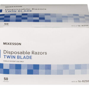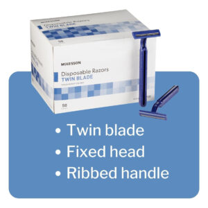 Lâminas de barbear descartáveis McKesson [100 unidades] Lâmina de barbear, lâmina dupla, lâmina de aço inoxidável, para homens e mulheres, a granel, azul, 50 unidades, pacote com 2 – A navalha descartável McKesson é de uso único. – Lâminas de barbear de ponta única com lâminas duplas em uma caixa em arco: corta o cabelo mais perto da pele, oferecendo um barbear suave – Cabeças de barbear fixas com lâminas de aço inoxidável; têm um braço curvo que oferece controle e precisão durante o barbear; alça nervurada para uma aderência firme – Capa dobrável para segurança; protege e elimina o risco de ferimentos durante o manuseio e durante o armazenamento – Com nervuras e alças contornadas para uma pegada confortável