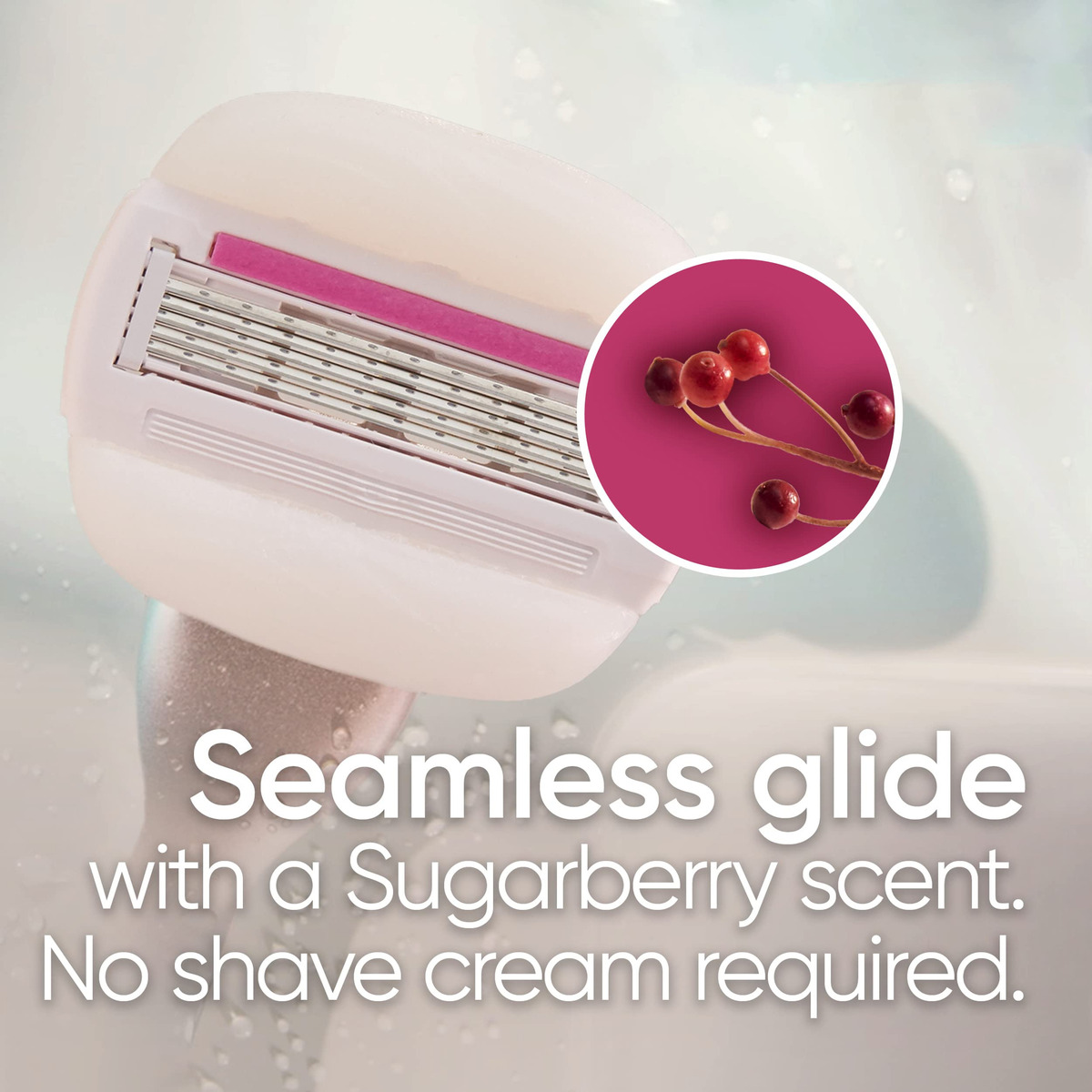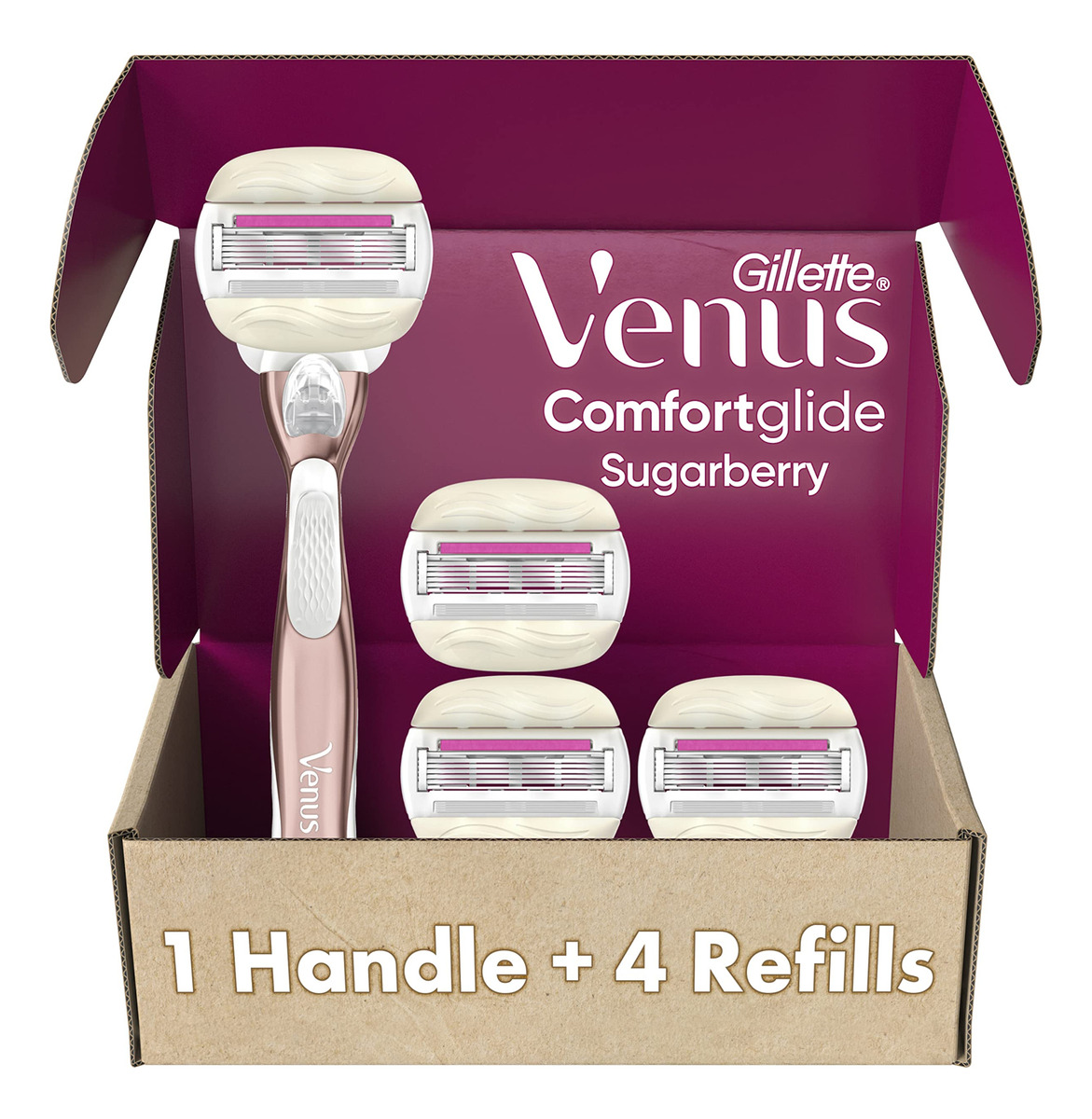 Gillette Venus, lâminas de barbear para mulheres, Comfortglide, barbeador feminino, Olay Sugarberry, recargas de barbear Venus para mulheres, alça de metal dourado rosa + 4 recargas de lâminas, lâminas de barbear, lâminas de barbear femininas para barbear – 5 lâminas para uma suavidade duradoura: cada recarga tem 5 lâminas revestidas em forma de diamante para proporcionar um barbear preciso e duradouro, e são projetadas para resistir à ferrugem – MENOS RESSECAMENTO: as barras hidratantes com condicionadores de pele Olay retêm a umidade para manter a pele seca sob controle – PROTEÇÃO DA PELE: as barras hidratantes da navalha liberam uma rica espuma de manteiga corporal, protegendo sua pele contra cortes , cortes e irritações. Proporciona um deslizamento perfeito a cada toque — Design giratório adaptável: essas máquinas de barbear femininas têm um design giratório que se ajusta ao corpo para máxima precisão — As barras hidratantes com aroma de amora açucarada deixam sua pele macia enquanto você se barbeia