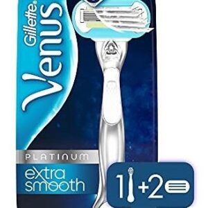 Lâminas de barbear Gillette Venus Deluxe Smooth Platinum para mulheres, 1 navalha Venus, 2 recargas de lâmina de barbear, alça de metal com alça antiderrapante – 5 lâminas para uma suavidade duradoura: essas máquinas de barbear femininas têm 5 lâminas para proporcionar um barbear extra suave e duradouro – Alça de metal: uma alça durável e ergonômica moldada para uma aderência confortável projetada para durar – PURA EFICÁCIA: cada uma dessas máquinas de barbear femininas As lâminas têm um revestimento semelhante a um diamante para cortar o cabelo com facilidade, proporcionando uma pele mais lisa. Barbeie-se bem, nada mais – PROTEÇÃO DA PELE: a faixa de umidade ativada por água fornece lubrificação para proteger sua pele contra cortes e cortes – Design adaptável: essas máquinas de barbear têm uma cabeça giratória que garante a precisão do barbear em áreas de difícil acesso. Não incline sua navalha de forma estranha — qualquer recarga de lâmina Venus cabe em qualquer cabo de barbear Venus (exceto a navalha de barbear Simply Venus e Venus Pubic Hair)