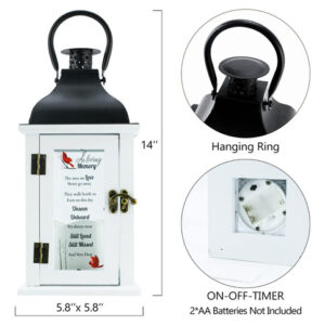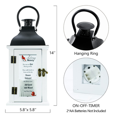 Memorial Lantern Bereavement Gifts in Memory of Loved One Gifts Memorial Gifts for Loss of Mother Loss of Father Gift Remembrance Gifts for Loss of Loved One Memorial Sympathy Gift – The Best Memorial Gift: Memorial lanterns are custom memorial gifts for lost loved ones, offering hope, comfort and help to a grieving friend or family member. Lighting candles and warm lights can soothe the sadness of family members and commemorate the lost relatives. Bereavement gifts. – Poetic Words: The memory of love, always loving and missing their loved ones, seems not to have passed away. Unseen, unheard, yet always near, still loved, still missed. In memory of loved one gifts. – Thickened Toughened Glass: The thickness of glass is up to 0.12 inches, and the glass is not fragile after toughening. The light of the candle shines brightly through it. The commemorative text on the glass surface is printed by UV computer printing instead of screen printing, and the definition is 100 times that of screen printing. – Exquisite Design: Made of solid wood and rust proof iron sheet. The round handle does not hurt the hand. Size: 14 x 5.8 x 5.8 inch, built-in 6 hour timed LED candle. Product with tag and ribbon .Two AA batteries are required(not included). The perfect sympathy and funeral gift for someone who lost their father, mother, grandfather, grandmother, son, daughter, brother, sister, uncle, aunt, etc. – A Meaningful Gift: Remembrance lantern for people who have lost friends or family. A unique way to treasure loved ones no longer with us. Suitable for hanging or free-standing use indoors or outdoors.