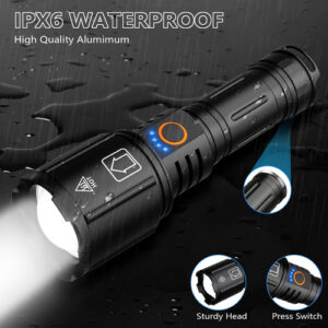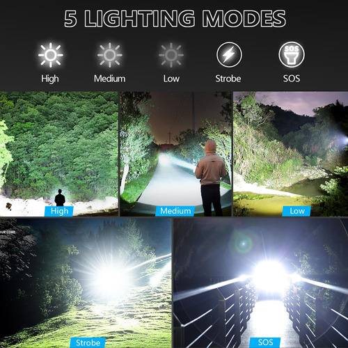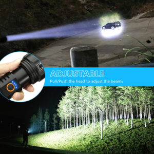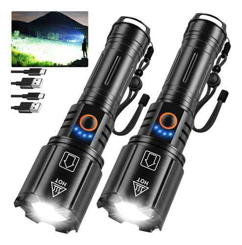 Lanterna recarregável NiaoChao de alto lúmen, pacote com 2 lanternas superbrilhantes de 990.000 lúmens para casa, 5 modos, impermeável IPX6, antiderrapante – lanternas de 990.000 lúmens Lanternas recarregáveis de alto lúmen com chips LED P70 superbrilhantes, a distância de iluminação é de até 2600 pés, a saída máxima é de 990.000 lúmens, varrendo luz brilhante ao longo de cerca de 3 bolas de futebol campos – Feixe ajustável Esta lanterna portátil tem a função de alternar o feixe de luz esticando a cabeça da lâmpada. Feixe amplo para iluminação de grandes áreas e feixe estreito para observação de longo alcance – 5 modos de luz As lanternas LED recarregáveis têm 5 modos de luz: alto, médio, baixo, estroboscópico e SOS, você pode alternar à vontade e se adaptar a diferentes ambientes de iluminação. Não é necessário percorrer todos os modos. O design One Key Turn Off pode ser desligado diretamente em qualquer modo pressionando longamente o botão 2s – 2 lanternas superbrilhantes recarregáveis por USB e saída USB incluem 2 baterias premium recarregáveis de 5000 Ah de grande capacidade que podem funcionar continuamente por até 10-12 horas. Ele também tem uma função de porta de saída de energia, então você pode usá-lo como um banco de energia para carregar seus dispositivos com os cabos de carregamento USB – 200.000 horas de vida útil As lanternas LED de alto lúmens têm uma função de alta dissipação de calor, fazendo com que a lanterna mais brilhante tenha uma vida útil de até 200.000 horas. Além disso, a lanterna também vem com 2 suportes de pilhas AAA que você pode usar. 3 pilhas AAA para abastecer a lanterna