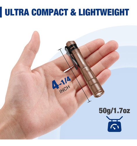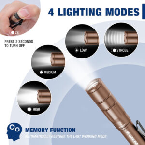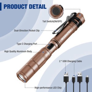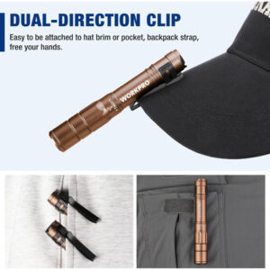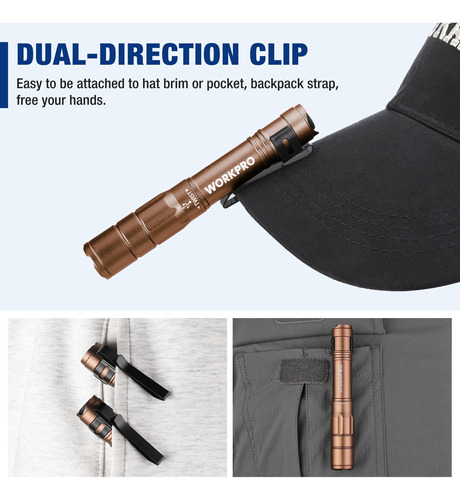Mini caneta recarregável WORKPRO (marrom), pacote com 2 unidades — pequena, mas poderosa: a lanterna WORKPRO Mini possui o LED altamente recomendado, que oferece incríveis 300 lúmens e uma distância de feixe de até 196 pés. Com seu design ultracompacto, medindo apenas 4-1/4 polegadas de comprimento e pesando apenas 50 g/1,7 oz, a pequena lanterna ocupa quase nenhum espaço no bolso – 4 modos e função de memória: a lanterna tem 4 modos de iluminação alta/média/baixa/estroboscópica (alta: 300 lúmens; feixe de 196 pés; funciona 1 hora; média: 150 lúmens; feixe de 164 pés; funciona 2,5 horas; baixa: 20 lúmens; feixe de pés; funciona 6,5 horas), pressione o botão liga/desliga para alternar os modos facilmente. Pressione e segure o botão por mais de dois segundos para desligar a lanterna diretamente. A lanterna de caneta tem uma função de memória e restaura automaticamente o último estado do modo de trabalho – Carregamento rápido de 1 hora: a lanterna de caneta recarregável pode ser totalmente carregada em 1 hora, carregando 200% mais rápido do que outras lanternas, sem necessidade de esperar muito tempo. Basta usar o cabo de carregamento Tipo C incluído para conectar a lanterna recarregável a qualquer fonte de alimentação USB (máx. 5V 0,5A) e desfrutar de uma recarga rápida e conveniente. Diga adeus às baterias descartáveis e olá às soluções de energia ecológicas – Materiais premium: as lanternas EDC são feitas de alumínio de qualidade aeronáutica, o que as torna resistentes ao desgaste com o tempo e podem resistir a quedas e solavancos. Testado com classificação de resistência à água IPX4 e resistência ao impacto de 1 metro (3 pés), ele pode ser usado em uma variedade de situações e ambientes. Os exemplos incluem acampar, caminhar, correr, andar de bicicleta e ler – interruptor traseiro e clipe de dupla direção: o interruptor de borracha aumenta o empuxo, evita a iluminação em bolsas ou bolsos e evita iluminação falsa. A lanterna de bolso vem com um clipe de bolso de dupla direção atualizado, facilitando a fixação na aba de um chapéu, calça mais grossa ou alça de mochila, transportada no bolso, mais do que apenas uma conveniência de usar as mãos livres – O que você ganha: 2 mini canetas recarregáveis, 2 cabos de carregamento USB tipo C. Se você tiver alguma dúvida ou insatisfação com nossos produtos, não hesite em nos contatar. A equipe de pós-venda da WORKPRO entrará em contato com você imediatamente para resolver seus problemas