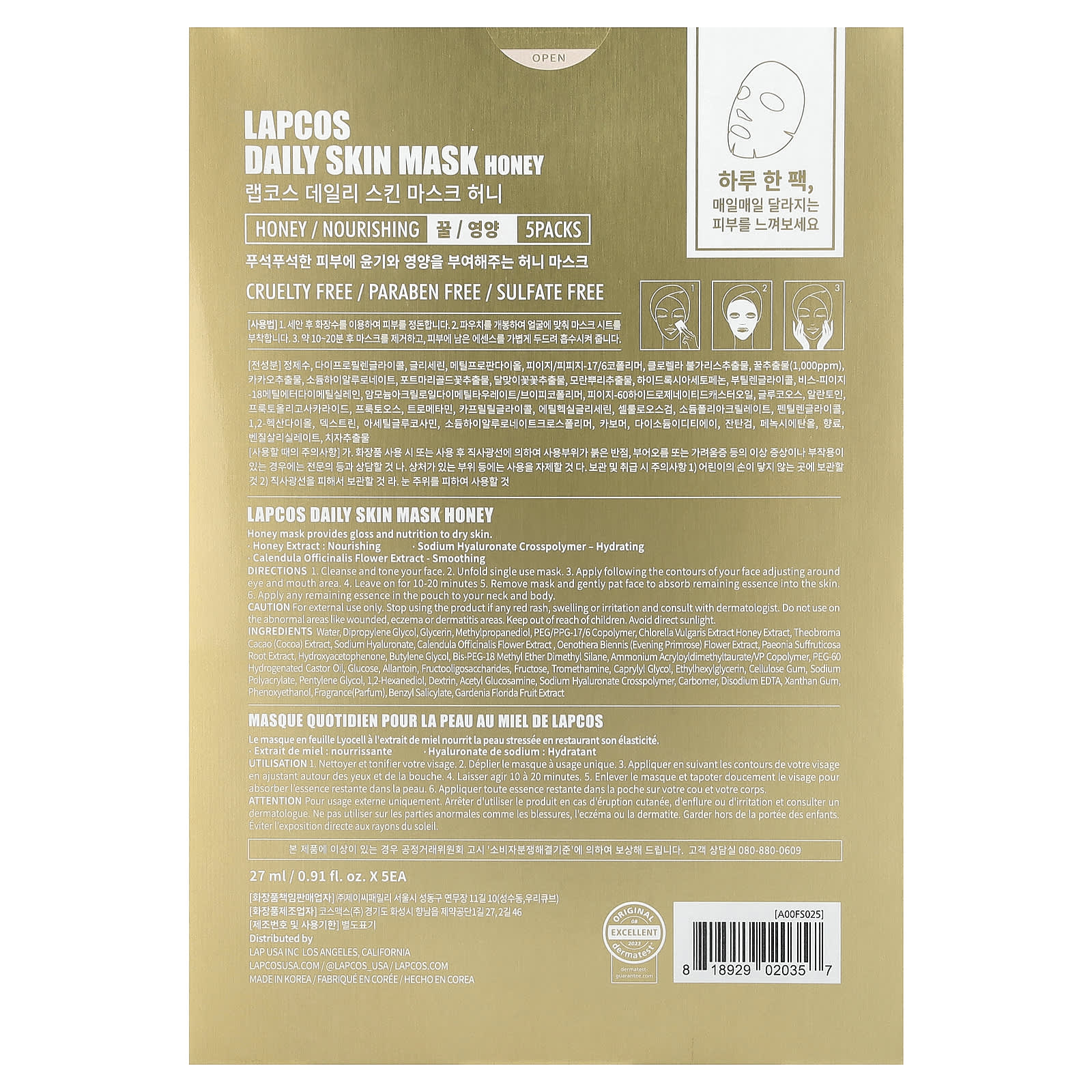 Lapcos Máscara de Mel Nutrição 5 Folhas 27 ml (091 fl oz) Cada – Lapcos Beleza Máscaras Faciais de Beleza Máscaras Faciais Máscaras em folha K-Beauty.