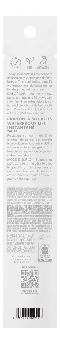 e.l.f. Instant Lift Waterproof Brow Pencil, Long-Lasting Eyebrow Pencil For Grooming & Shaping Brows, Vegan & Cruelty-free, Taupe – HIGH-PIGMENT, WATERPROOF BROW PENCIL: Shape, fill and define your natural brows for a look that stays putrain or shine! e.l.f. Cosmetics Instant Lift Waterproof Brow Pencil delivers rich, smudge-resistant pigment. – FOR PRECISE APPLICATION: The e.l.f. Instant Lift Waterproof Brow Pencil is dual-sided and features a precision tip, allowing you to fill in sparse areas or create bold definition with the smooth, creamy formula. – CREATES A NATURAL-LOOKING FINISH: The spoolie end grooms and shapes brow hairs for a natural-looking finish. – AVAILABLE IN SIX SHADES: Available in six high-pigment shades. – SKIN-LOVING INGREDIENTS: All e.l.f. products are made from skin-loving ingredients you want, minus the toxins you dontall at good-for-you prices. All e.l.f. products are 100% cruelty-free and Vegan. .