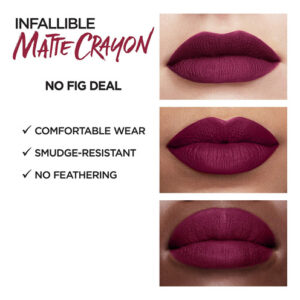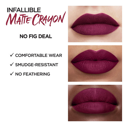 Lápis labial fosco infalível LoRal Paris, sem flores e figos (a embalagem pode variar) — Cor labial de longa duração: o lápis labial cremoso possui uma ponta mecânica ergonômica para facilitar a aplicação e cobertura com um toque em qualquer lugar; sem manchas ou penas para um uso confortável e duradouro — Cobertura total em apenas um toque: nosso primeiro lápis labial fosco com uso duradouro e cor saturada; aprimorado com um doce caramelo aroma de gel, este lápis labial está disponível em 18 tons para todos os tons de pele – The Perfect Shade: oferecemos batom em todos os formatos: líquidos, balas e bálsamos derretidos para impacto máximo; com tons de vermelho forte a quase nus, encontre a tonalidade e o formato perfeitos para você – Tudo sobre beleza: mantenha seu estoque de beleza abastecido com o melhor; temos uma variedade de produtos para ajudá-lo a obter qualquer look – se você precisa de maquiagem para olhos para um gato incrível ou maquiagem facial para uma tez perfeita – Inovação da L'Oreal: como a maior marca de beleza do mundo, temos uma compromisso de combinar o que há de mais moderno em tecnologia com a mais alta qualidade para obter o máximo em beleza luxuosa