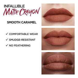 Lápis labial fosco infalível LoRal Paris, caramelo suave (a embalagem pode variar) — Cor labial de longa duração: o lápis labial cremoso possui uma ponta mecânica ergonômica para facilitar a aplicação e cobertura com um toque único em qualquer lugar; sem manchas ou penas para um uso confortável e duradouro — Cobertura total em apenas um toque: nosso primeiro lápis labial fosco com uso duradouro e cor saturada; aprimorado com um aroma doce de caramelo este lápis labial está disponível em 18 tons para todos os tons de pele – The Perfect Shade: oferecemos batom em todos os formatos: líquidos, balas e bálsamos derretidos para impacto máximo; com tons de vermelhos fortes a quase nus, encontre a tonalidade e o formato perfeitos para você – Tudo sobre beleza: mantenha seu estoque de beleza abastecido com o melhor; temos uma variedade de produtos para ajudá-lo a obter qualquer look – se você precisa de maquiagem para olhos para um gato incrível ou maquiagem facial para uma tez perfeita – Inovação da L'Oreal: como a maior marca de beleza do mundo, temos uma compromisso de combinar o que há de mais moderno em tecnologia com a mais alta qualidade para obter o máximo em beleza luxuosa