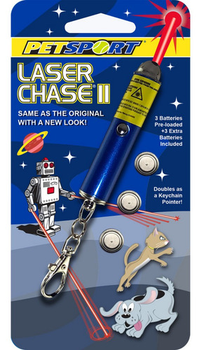 O brinquedo Laser Chase II é um ótimo jogo interativo para você e seu animal de estimação. Seu animal de estimação fará muitos exercícios ao perseguir o Laser Chase II; onde quer que você aponte, seu animal de estimação certamente o seguirá! A capa do Laser Chase II vem em cores variadas – vamos escolher uma cor para você. Animais de estimação perseguem o irresistível ponto vermelhoFunciona como ponteiro de chaveiroMais divertido do que perseguir seu próprio rabo! Baterias incluídasO invólucro laser vem em cores variadas. O Laser Chase é o brinquedo apontador a laser original para animais de estimação e agora está disponível em 1mW. Cães, gatos, pássaros, lagartos e até peixes enlouquecem enquanto perseguem a luz vermelha onde quer que você a aponte. O Laser Chase II tem um visual mais novo e vem com um conjunto extra de baterias para o caso de a diversão acabar. Está em conformidade com os padrões de segurança de brinquedos infantis dos Brasil e da Europa (CPSIA, ASTM-F963, EN-71).