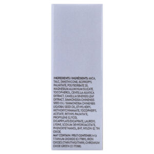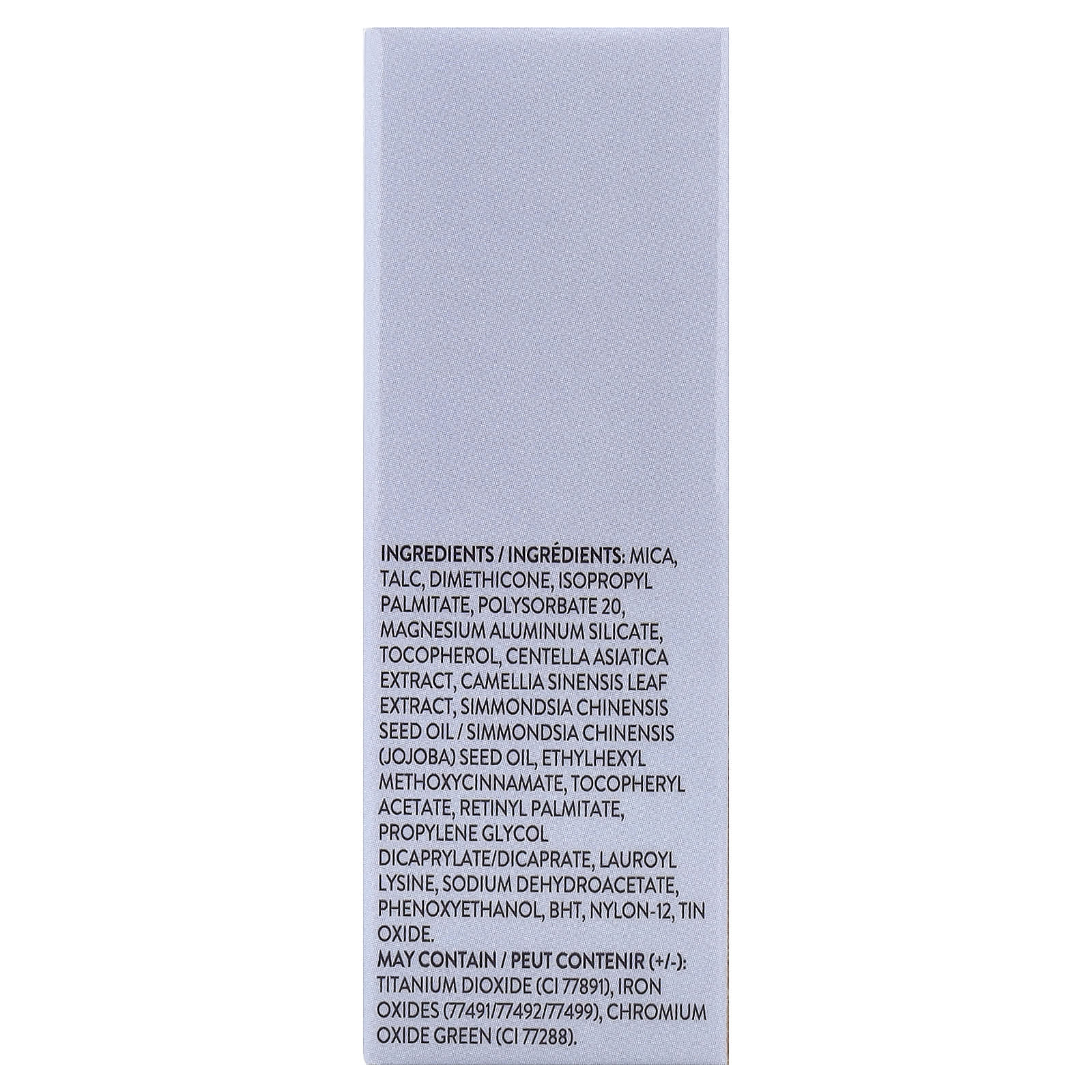 Mica, talco, dimeticona, palmitato de isopropila, silicato de alumínio de magnésio polissorbato 20, tocoferol, extrato de Centella asiatica, extrato da folha de Camellia sinensis, óleo da semente de Simmondsia chinensis/óleo da semente de Simmondsia chinensis (jojoba), octinoxato, acetato de tocoferol, palmitato de retinol, propylene glycol dicaprylate/dicaprate, lauroil lisina, sodium dehydroacetate, fenoxietanol, bht, náilon-12, tin oxide. Pode conter (+/-): dióxido de titânio (CI 77891), óxidos de ferro (77491/77492/77499), verde de óxido de cromo (CI 77288).