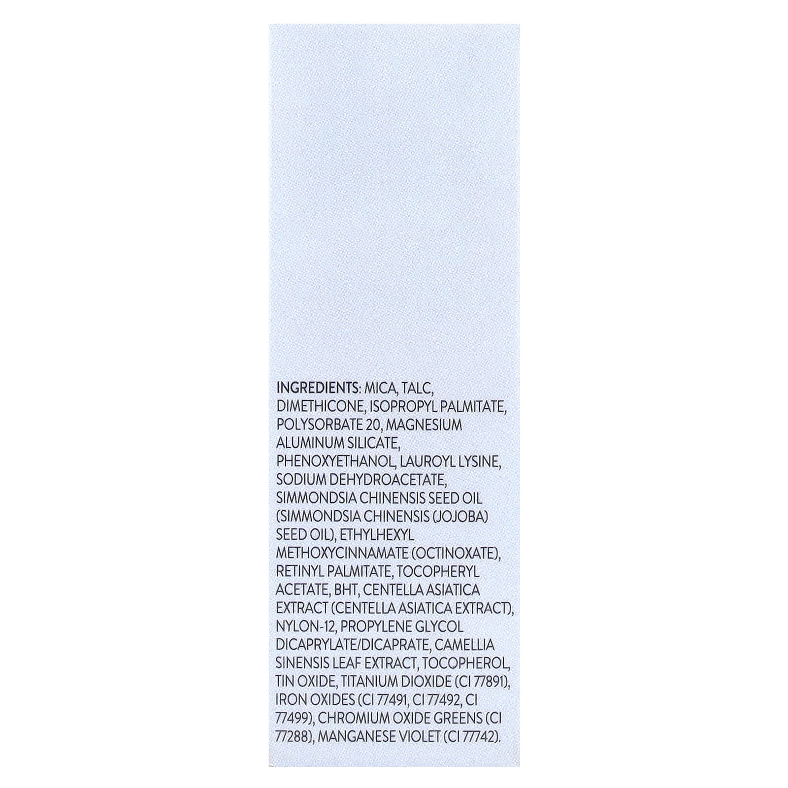 Mica, talco, dimeticona, palmitato de isopropila, polissorbato 20, silicato de alumínio e magnésio, fenoxietanol, lauroil lisina, sodium dehydroacetate, óleo da semente de Simmondsia chinensis (óleo da semente de Simmondsia chinensis (jojoba)), ethylhexyl methoxycinnamate (octinoxato), palmitato de retinol, acetato de tocoferol, bht, extrato de Centella asiatica (extrato de Centella asiatica), náilon-12, propylene glycol dicaprylate/dicaprate, extrato da folha de Camellia sinensis, óxido de estanho de tocoferol, dióxido de titânio (CI 77891), óxidos de ferro (CI 77491, CI 77492, CI 77499), verdes de óxido de cromo (CI 77288), violeta de manganês (CI 77742).
