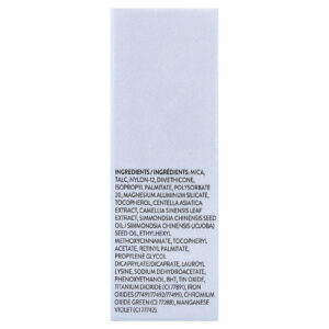Mica, talco, náilon-12, dimeticona, palmitato de isopropila, polissorbato 20, silicato de alumínio de magnésio. tocoferol, extrato de Centella asiatica, extrato da folha de Camellia sinensis, óleo da semente de Simmondsia chinensis/óleo da semente de Simmondsia chinensis (jojoba), octinoxato, acetato de tocoferol, palmitato de retinol, propylene glycol dicaprylate/dicaprate, lauroil lisina, sodium dehydroacetate, fenoxietanol, bht, óxido de estanho, dióxido de titânio (CI 77891), óxidos de ferro (77491/77492/77499), verde óxido de cromo (CI 77288), violeta de manganês (CI 77742).