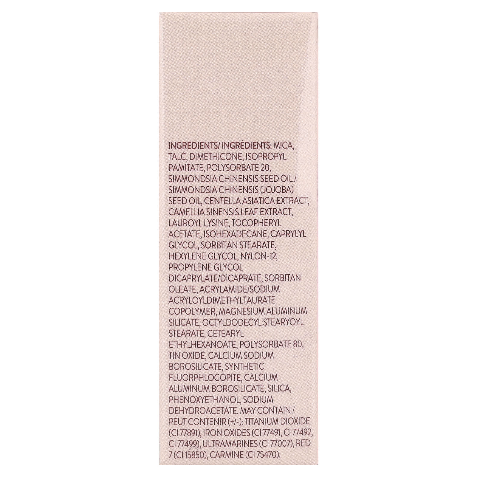 Mica, talco, dimeticona, palmitato de isopropila, polissorbato 20, óleo da semente de Simmondsia chinensis/óleo da semente de Simmondsia chinensis (jojoba), extrato de Centella asiatica, extrato da folha de Camellia sinensis, lauroil lisina, acetato de tocoferol, isohexadecane, caprylyl glycol, estearato de sorbitana, hexylene glycol, náilon-12, propylene glycol dicaprylate/dicaprate, oleato de sorbitana, acrylamide/sodium acryloyldimethyltaurate copolymer, silicato de alumínio e magnésio, octyldodecyl stearoyl stearate, cetearyl ethylhexanoate, polissorbato 80 óxido de estanho, calcium sodium borosilicate, synthetic fluorphlogopite, calcium aluminum borosilicate, sílica, fenoxietanol, dehidroacetato de sódio. Pode conter / peut contenir (+/-): dióxido de titânio (CI 77891), óxidos de ferro (CI 77491, CI 77492, CI 77499), ultramarines (CI 77007), vermelho 7 (CI 15850), carmina (CI 75470).