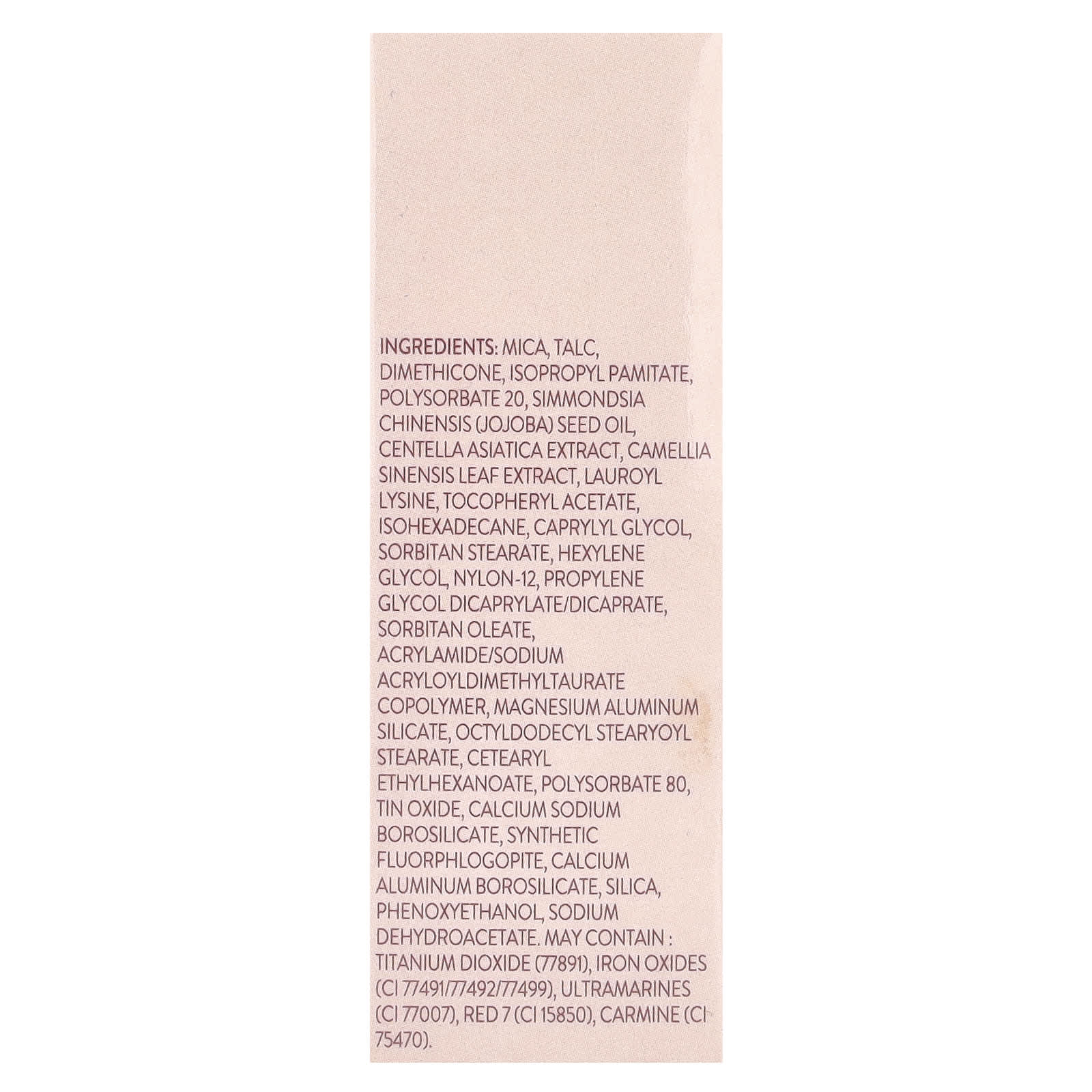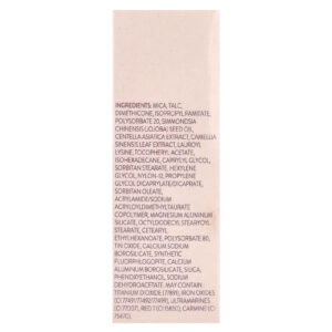 Mica, talco, dimeticona, pamitato de isopropila, polissorbato 20, óleo da semente de Simmondsia chinensis (jojoba), extrato de Centella asiatica, extrato da folha de Camellia sinensis, lauroil lisina, acetato de tocoferol, isohexadecane, caprylyl glycol, estearato de sorbitana, hexylene glycol, náilon-12, propylene glycol dicaprylate/dicaprate, oleato de sorbitana, acrylamide/sodium acryloyldimethyltaurate copolymer, silicato de alumínio e magnésio, octildodecil stearyoyl stearate, cetearyl ethylhexanoate, polissorbato 80, óxido de estanho, calcium sodium borosilicate, synthetic fluorphlogopite, calcium aluminum borosilicate, sílica, fenoxietanol, dehidroacetato de sódio. Pode conter: dióxido de titânio (77891), óxidos de ferro (CI 77491/77492/77499), ultramarines (CI 77007), vermelho 7 (CI 15850), carmina (CI 75470).