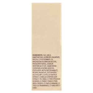 Talco, mica, dimeticona, palmitato de isopropila, náilon-12, silicato de alumínio de magnésio polissorbato-20, fenoxietanol, sodium dehydroacetate, óleo da semente de Simmondsia chinensis (jojoba), ethylhexyl methoxycinnamate retinol palmitate, acetato de tocoferol, bht, extrato de Centella asiatica, extrato da folha de Camellia sinensis, óxido de estanho, CI 77891 (dióxido de titânio), CI 77491/CI 77492/CI 77499 (óxidos de ferro), CI 75470 (carmim), CI 77007 (ultramarinos), CI 15850 (vermelho 7 laca de alumínio).