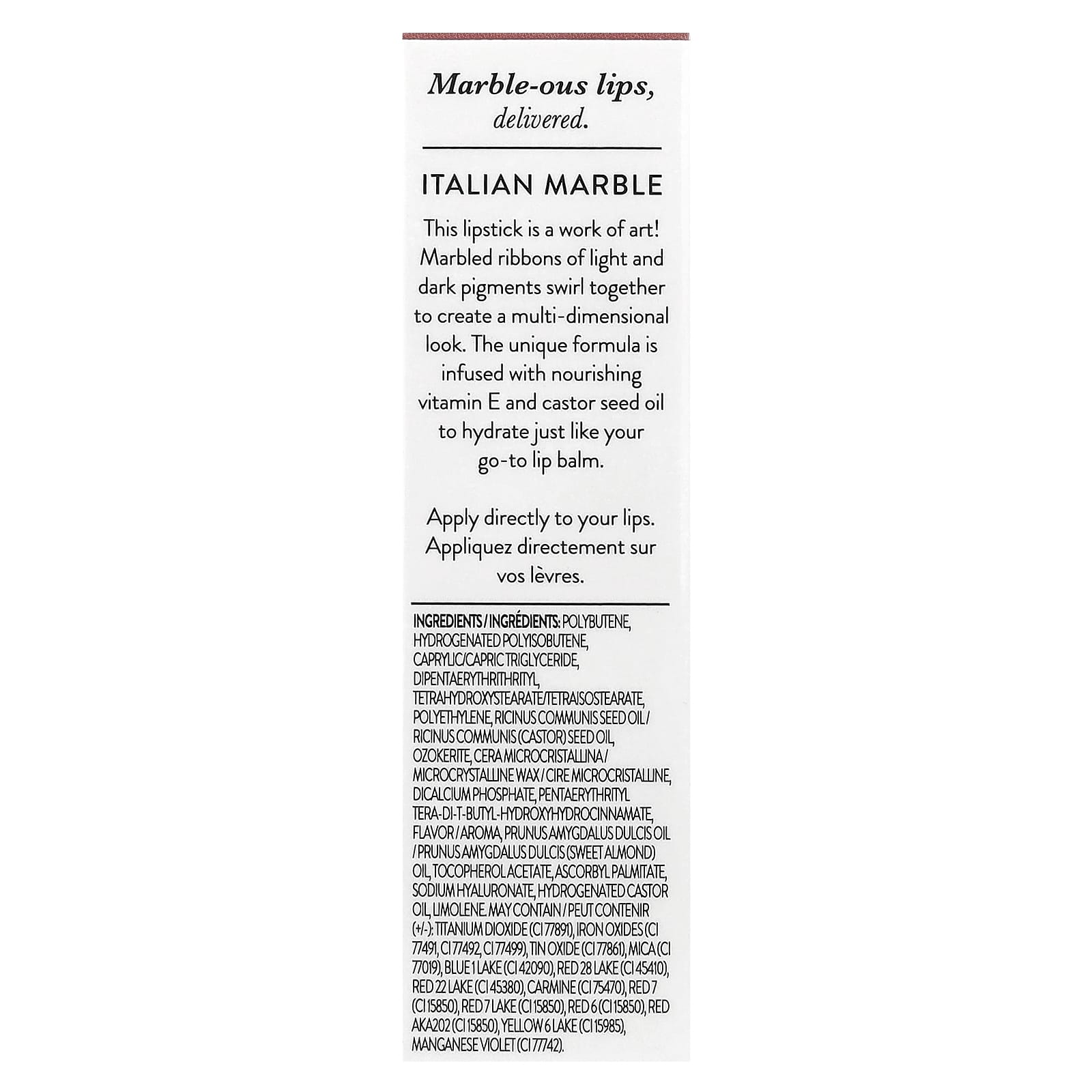 Esse batom é uma obra de arte! Fitas marmorizadas de pigmentos claros e escuros giram juntas para criar uma aparência multidimencional. A fórmula exclusiva é infundida com vitamina E nutritiva e óleo da semente de rícino para hidratar, como seu balm labial de escolha.
