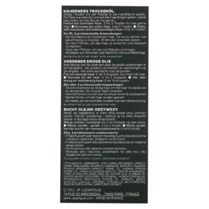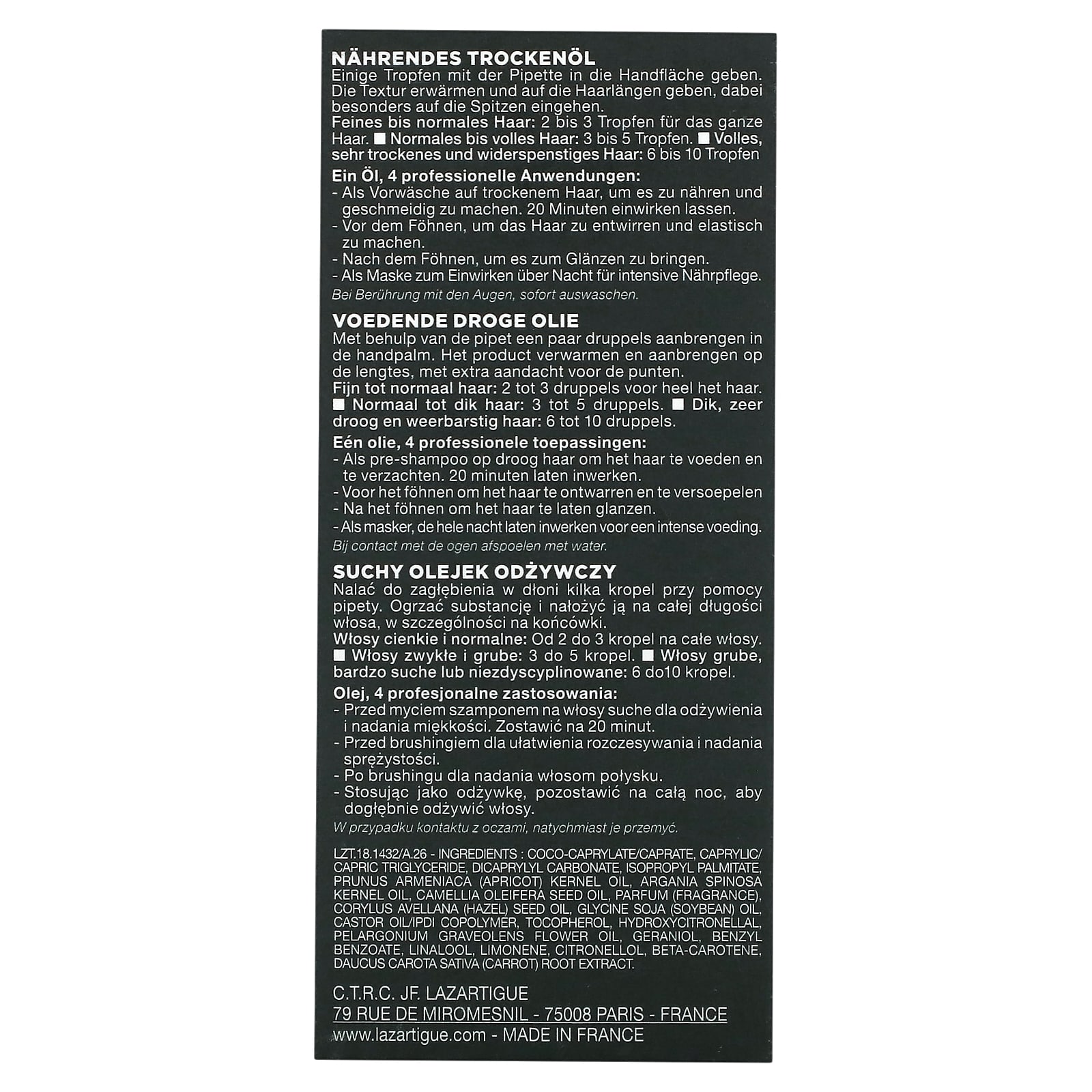 Inspirada em rituais de beleza enriquecidos com óleos botânicos puros, a Lazartigue criou o 1º * óleo sem silicone e de origem natural que nutre a fibra, realça os cabelos e dá brilho intenso sem acabamento oleoso. Em seu cerne está um tesouro nutritivo: o Nectar des Rêves. Esta mistura calibrada dos óleos naturais mais preciosos inclui óleo de argão altamente nutritivo, óleo de damasco suavizante, óleo de camélia fortalecedor e óleo de gerânio egípcio reparador. Sua textura fluida e sua fragrância floral fresca envolvem suavemente os cabelos. Com a pipeta, coloque algumas gotas na palma da mão. Aqueça o produto e aplique nos comprimentos, com foco nas pontas.