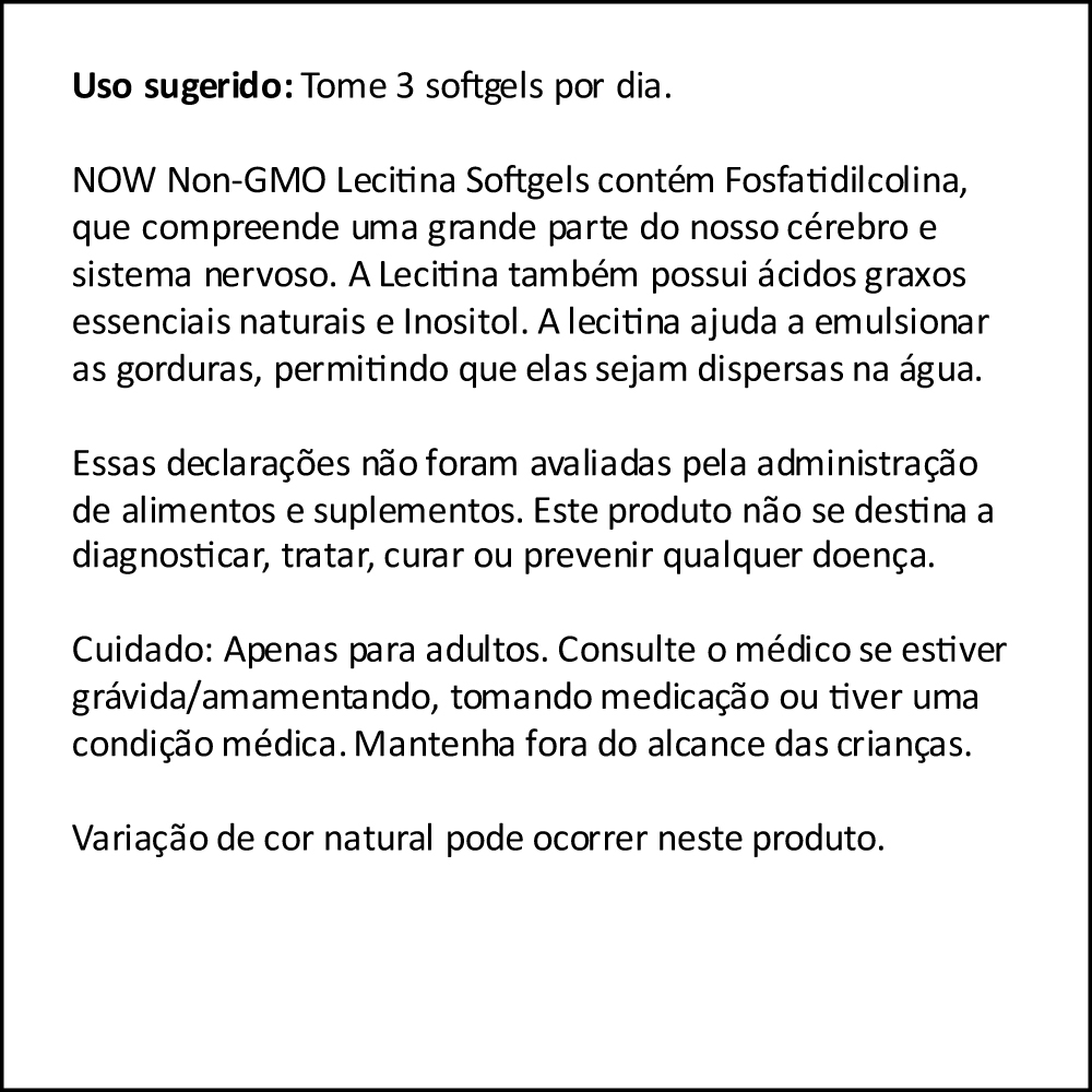 Kit Lecitina 1200mg Now Foods 100Caps Softgels + Porta Cápsulas Suporte Nutricional para Funções Corporais: A Lecitina da Now Foods, com 1200mg por softgel, é conhecida por seu papel no suporte de diversas funções corporais, incluindo a manutenção de células saudáveis e a otimização da função cerebral. Este suplemento é ideal para quem busca um apoio nutricional abrangente. Softgels de Alta Potência e Fáceis de Consumir: Apresentado em um frasco com 100 softgels, este suplemento oferece uma forma prática e eficiente de consumir lecitina. As softgels são fáceis de engolir e fornecem uma dosagem consistente de 1200mg. Produto Importado de Alta Qualidade: Este suplemento é importado, garantindo a alta qualidade associada à marca Now Foods. Com disponibilidade para pronta entrega, você pode desfrutar dos Destaques de um produto internacional de alta qualidade sem longas esperas. Porta Cápsulas com Duas Repartições: O kit também inclui um porta-cápsulas prático, dividido em duas seções internas. Isso permite uma organização eficaz e separada de diferentes tipos de cápsulas ou pílulas. Composição Pura e Eficaz: Cada softgel contém 1200mg de Lecitina, sem aditivos desnecessários. A formulação é focada em fornecer um suplemento de alta qualidade, mantendo a pureza e a eficácia do ingrediente ativo. VALIDADE LONGA