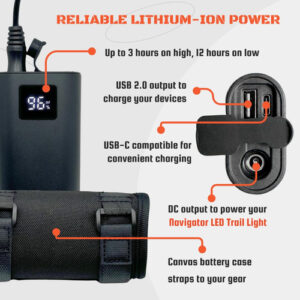 Ilumine a trilha como nunca antes com a luz de trilha LED Dango Design Navigator! Projetado para o aventureiro, este kit de luz LED ultracompacto e poderoso é o complemento perfeito para sua configuração de bicicleta suja ou mountain bike. O Navigator LED Trail Light é construído em torno de impressionantes LEDs com classificação de 2100 lúmens com tecnologia Cree de alto desempenho, iluminando trilhas, acampamentos e qualquer área difícil de ver. Monte-o no capacete com os suportes adesivos incluídos ou emparelhe-o com o suporte Dango Design Gripper (vendido separadamente) para obter uma solução de montagem liga/desliga rápida, segura e versátil no protetor de queixo do capacete. Esteja você andando à noite ou montando um acampamento, essa luz oferece três modos de potência (baixo, médio e alto), para que você possa ajustar o brilho para qualquer situação e otimizar a vida útil da bateria. A bateria externa recarregável de íon de lítio oferece uma leitura digital, para que você sempre saiba quanta energia resta. Ele não apenas alimenta o Navigator por mais de 3 horas em alta e até 12 horas em baixa, mas também funciona como um banco de energia, permitindo que você carregue seus outros dispositivos em qualquer lugar. Construído para caber em qualquer suporte no estilo de câmera de ação, o Navigator é uma luz LED versátil pronta para sua próxima aventura. – Caixa de LED de alumínio leve de perfil ultrabaixo – Potentes LEDs de 2100 lúmens com tecnologia LED Cree – Bateria externa de longa duração com leitura digital para rastreamento de energia – Bateria de uso duplo que funciona como um banco de energia para carregar seus dispositivos – Dura até 3 horas no modo alto e até 12 horas no modo baixo – Opções de montagem universais compatíveis com todos os suportes de dedo para câmeras de ação – Três configurações de brilho ajustáveis para iluminação personalizada — Inclui luz, bateria, carregador de parede com cabo USB-C, hardware de montagem da câmera, estojo de bateria de lona e estojo de viagem em EVA — Emparelhe-o com o suporte Dango Gripper (vendido separadamente) para montagem rápida no protetor de queixo do capacete