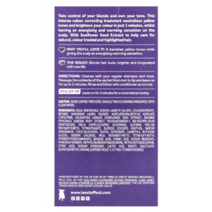 Assuma o controle do seu loiro e seja dona do seu tom. Este tratamento intenso de correção da cor neutraliza os tons amarelados e ilumina a cor em apenas 2 minutos, ao mesmo tempo que deixa uma sensação energizante e quente no couro cabeludo. Com Extrato da Semente de Girassol para ajudar a cuidar de cabelos naturais, tingidos e com mechas.
