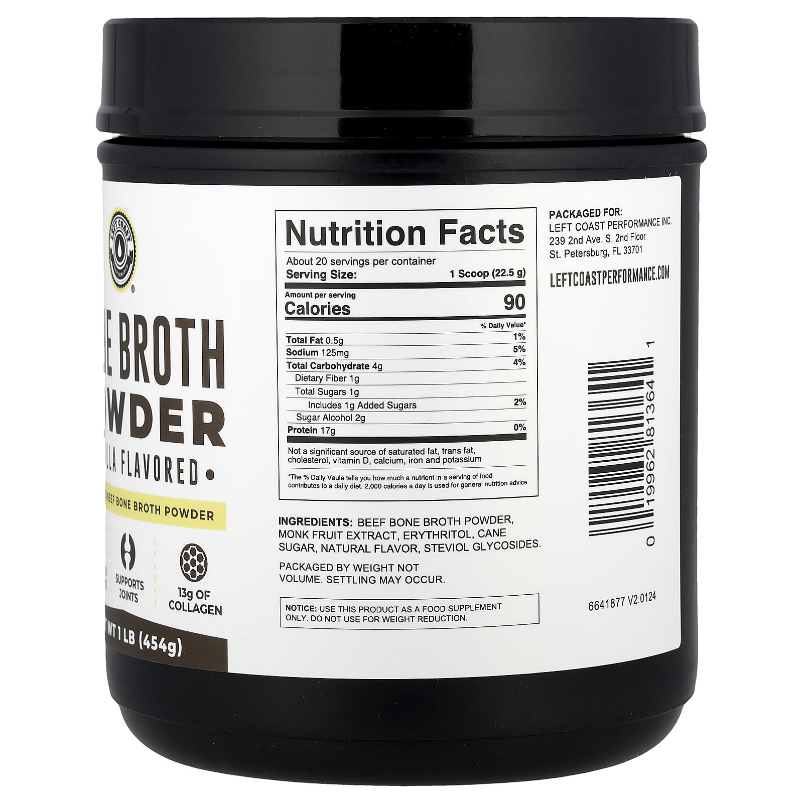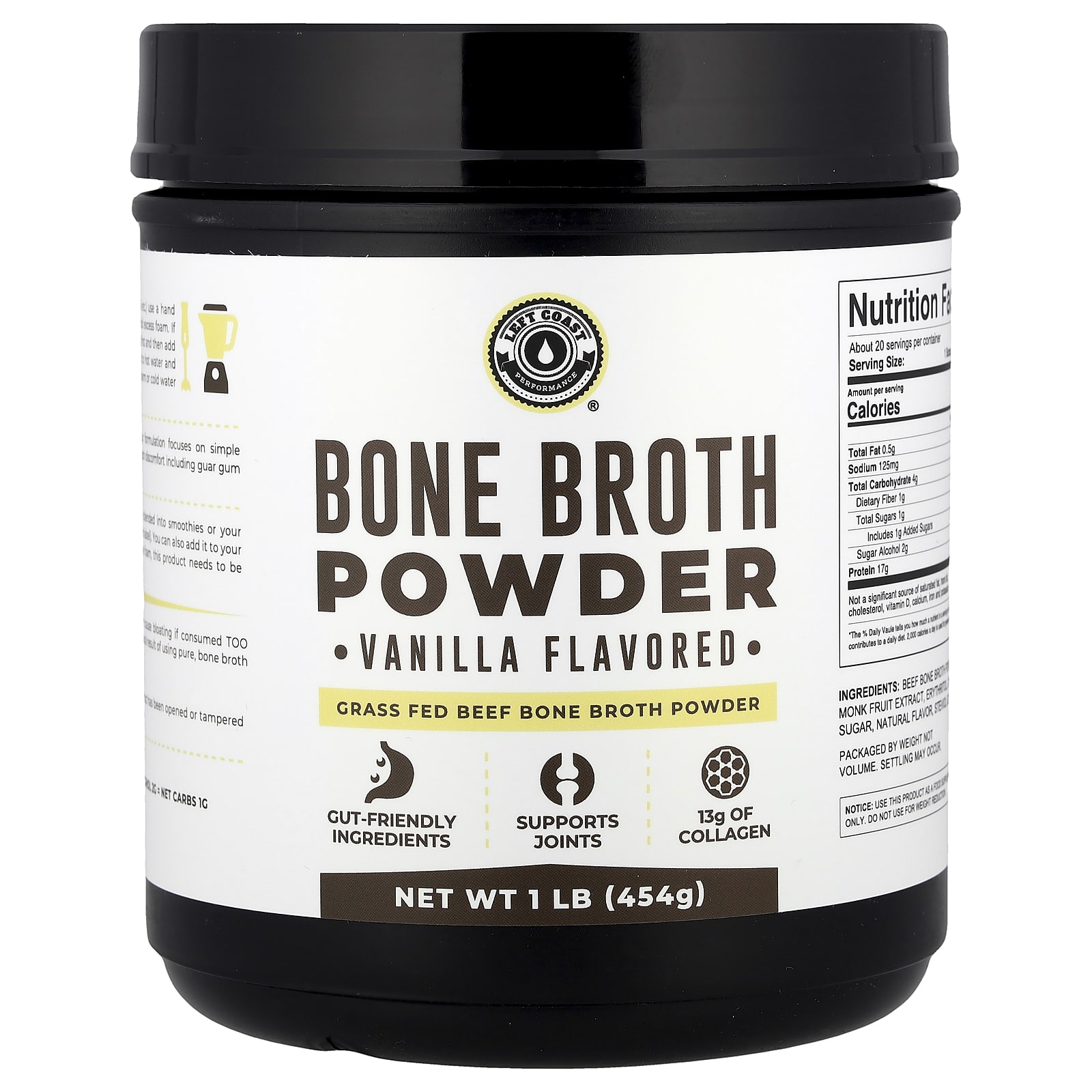 Left Coast Performance Caldo de Ossos em Pó Baunilha 454 g (1 lb) – Left Coast Performance Suplementos Ossos, Articulações e Cartilagem Caldo de ossos.