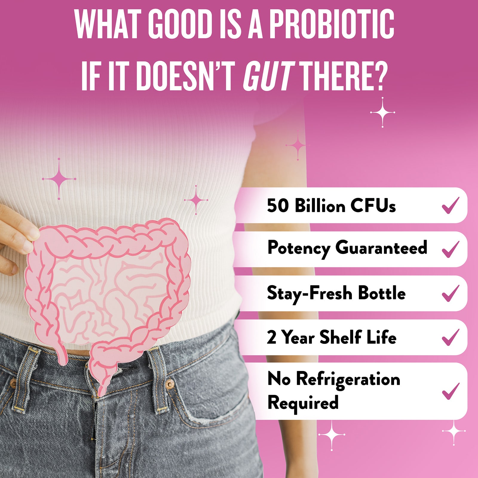 - Uma mistura de probióticos para a saúde da mulher especialmente formulada para ser tomada uma vez ao dia.