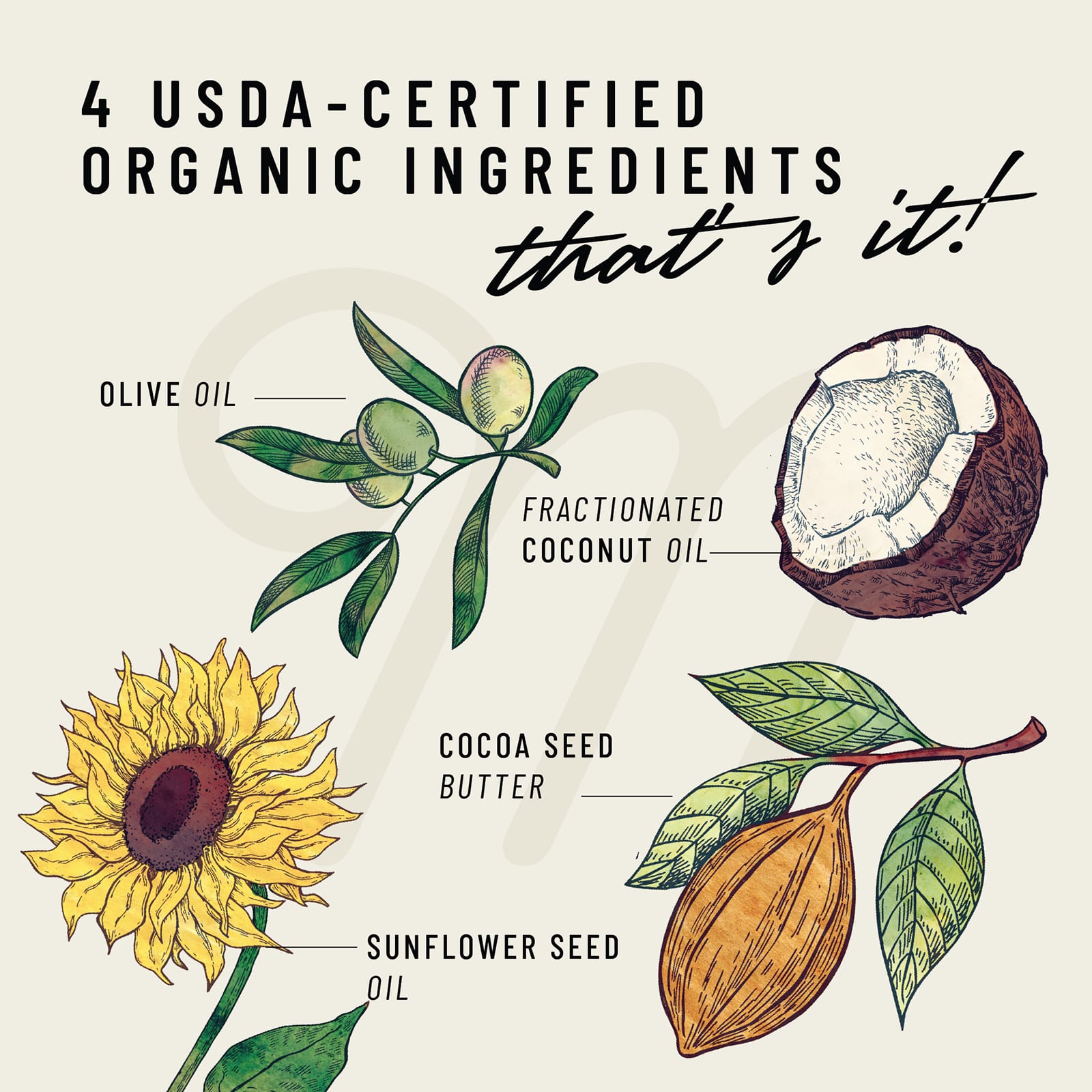 Óleo de coco fracionado orgânico (caprylic/capric triglyceride), óleo de oliva (Olea europaea) orgânico, óleo da semente de girassol orgânico (Helianthus annuus), manteiga da semente de cacau (Theobroma cacao) orgânico.