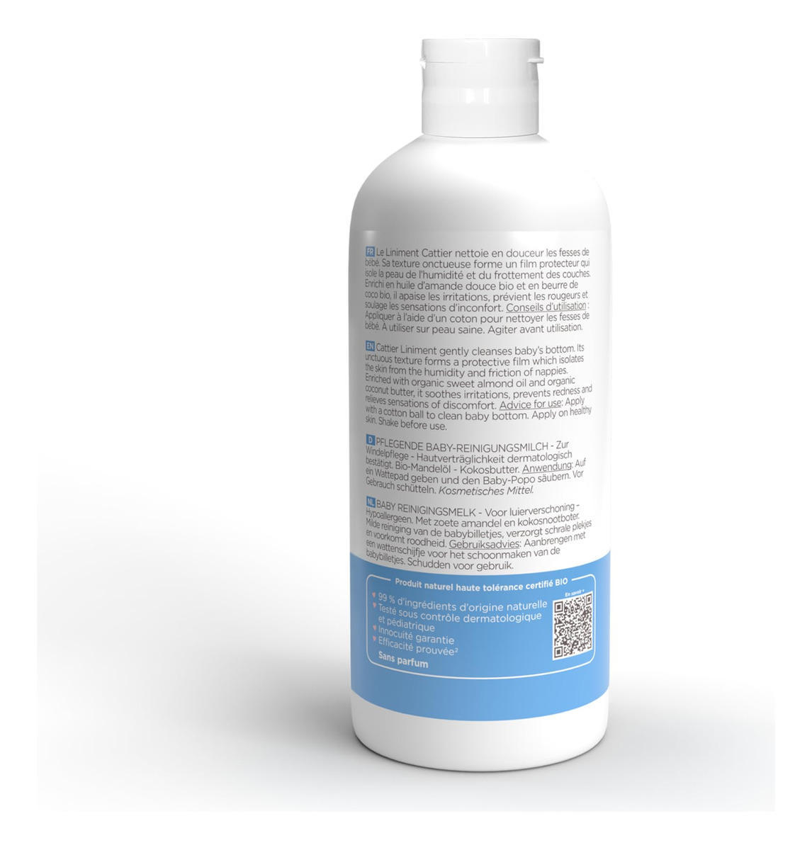 Leite de limpeza para troca de fraldas no linimento que acalma, limpa e protege suavemente. Rico em óleo de amêndoa doce e manteiga de coco, forma uma película protetora que isola a pele da umidade e do atrito das fraldas.