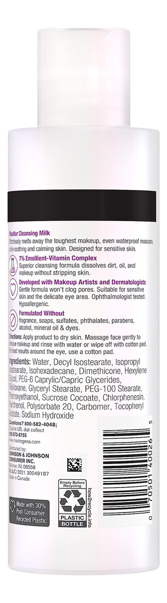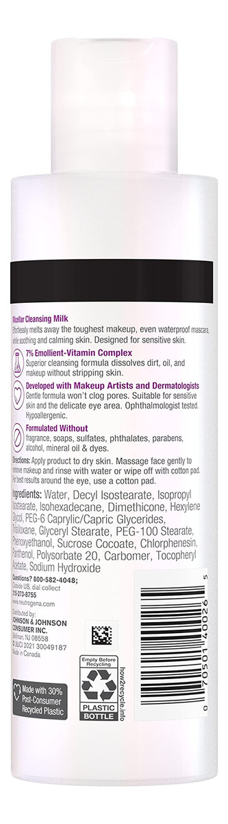 Melt away makeup while nourishing your skin with Neutrogena Makeup Melting Micellar Milk. This gentle, oil-free makeup remover from a dermatologist-recommended brand is suitable for sensitive skin and effortlessly melts away stubborn eye, face, and lip makeup without drying. Developed with dermatologists and makeup artists, the soothing, fragrance-free micellar milk formula contains Neutrogena patent-pending 7% Emollient-Vitamin Complex and skin conditioners to help soften and condition skin while melting away stubborn makeup. The pH-balanced micellar makeup remover is ophthalmologist tested and suitable for the delicate eye area. Its also soap-, paraben-, phthalate-, alcohol-, mineral oil-, and dye-free. To use, apply the sensitive skin makeup remover to skin and massage gently. To remove, rinse with water or wipe off with a cotton pad, and use a cotton pad around the eye area.