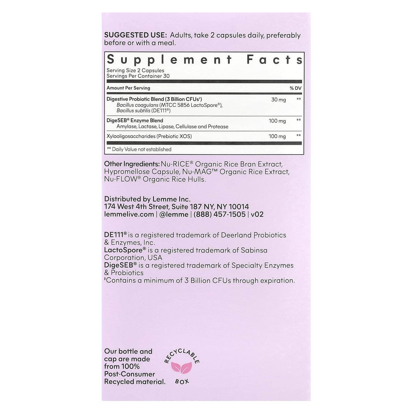 | Mistura Probiótica Digestiva (3 Bilhões de UFCs‡) Bacillus coagulans (MTCC 5856 LactoSpore®), Bacillus subtilis (DE111®) |