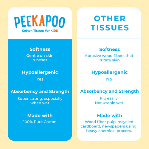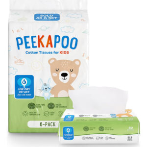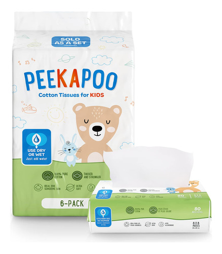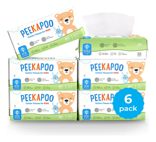 Calling all parents Peekapoos Cotton Tissues for Kids are here to tackle all messy situations! As parents, we always want the highest quality products for our childs sensitive skin and thats a job that never ends! Thats why weve created cotton tissues for kids that have absolutely zero chemicals, are extremely versatile and made with only one ingredient 100% pure and soothing cotton. STRONG WHEN WET AND DRY Peekapoo has designed a durable facial cotton tissue that is strong enough to be used both wet and dry, ensuring even the dried-up messes can be cleaned effectively. Its thick fabric is built to withstand mess without tearing and will not rip or dissolve when soaked in water! The 2-in-1 design of our infant cotton tissue also makes them the perfect alternative to baby dry wipes. They are biodegradable, hypoallergenic and the perfect travel size tissues to pop into your bag you wont know how you survived without them! SO MANY USES YOU WONT KNOW WHERE TO START A handy box of tissues for a wide range of uses. Whether youre in need of a nose tissue for cleaning up runny noses, dry wipes for baby drool, wet wipes during nursing, sensitive baby wipes during diaper changes or baby cleaning wipes for those sticky fingers and mouths during mealtimes, the list goes on. Peekapoo tissues will be there, ready to use. PEEKAPOO COTTON FACE TISSUE – KIND TO SKIN AND THE ENVIRONMENT Thanks to the ZERO chemicals, additives, preservatives, or fragrances in our kids tissue boxes, even with repeated use, your children wont experience rashes, irritation, dry noses or mouths! Better yet, they are completely biodegradable tissues, meaning you can easily dispose of them at home or on the go without leaving a negative environmental footprint. Order our child friendly, hypoallergenic facial tissues today your little ones will thank you! – Use WET or DRY: Designed for use both wet and dry, Peekapoo soft cotton tissues are much more versatile than standard paper tissues. Runny noses, baby drool, messy dinner times, nursing, and diapers changes whatever the situation, a Peekapoo hypoallergenic tissue will have you covered – SUPER STRONG, SOFT COTTON TISSUES: We understand the need for strong, absorbent materials to combat mess, which is why our thick cotton body and facial tissues are resilient, even when soaked in water. Thanks to their super strength, Peekapoo kids tissues are a handy alternative to dry baby wipes when youre out and about – SUITABLE FOR SENSITIVE SKIN: Made from 100% pure cotton, without any chemicals or additives, these extremely soft tissues are designed to be gentle on all skin types, especially the youngest and most sensitive. Use the hypoallergenic tissues repeatedly on your little ones skin without causing irritation, roughness, or discomfort – KIND TO THE ENVIRONMENT: Our 100% biodegradable cotton facial tissue is safe for your childrens hands, mouth and nose, as well as the environment! They are great for use at home or as travel tissues and you can dispose of them with peace of mind, knowing theyre kind to the planet – 6 X TISSUE PACKS: The delivery includes 6 packs of Peekapoo cotton tissues, each containing 80 tissues. Be prepared for all messy situations with these ultra absorbent soft tissues no mess stands a chance