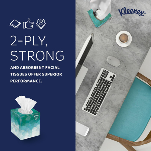 All facial tissues are not created equal. In fact, more people choose Kleenex Facial Tissue than any other brand. Kleenex tissue offers superior performance, a premium feel and essential softness When your employees, clients and visitors see the respected Kleenex brand in your offices and restrooms, theyll know that you select quality products, putting forth the best image for your business. Choosing Kleenex lets everyone know that you care enough to provide the very best. 36 Boxes/Case; Each white Kleenex tissue is 2-ply, absorbent, soft and strong Kleenex is the worlds number one face tissue brand, trusted by more consumers than any other The Kleenex brand face tissue has an 80 year history of excellence and high performance The low-alert dispenser keeps you ahead of run-outs (final 10 tissues are cream instead of white, so youll know its time to replace the box) These bulk tissues are Forest Stewardship Council (FSC) certified – All facial tissues are not created equal. In fact, more people choose Kleenex Facial Tissue than any other brand. Kleenex tissue offers superior performance, a premium feel and essential softness – When your employees, clients and visitors see the respected Kleenex brand in your offices and restrooms, theyll know that you select quality products, putting forth the best image for your business. – Choosing Kleenex lets everyone know that you care enough to provide the very best. – 36 Boxes/Case; Each white Kleenex tissue is 2-ply, absorbent, soft and strong – Kleenex is the worlds number one face tissue brand, trusted by more consumers than any other