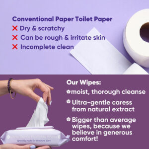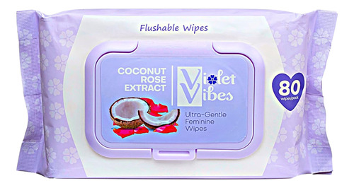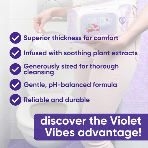 Get ready to experience a complete hygiene revolution with Violet Vibes Flushable Wipes. Youre not just buying a pack of wipes – youre investing in a premium lifestyle, blending cleanliness and luxury into an exceptional experience for both adults and kids. Imagine this: Youre on the move, juggling lifes demands, and suddenly, you feel the need for a quick freshen-up. Not a problem! Violet Vibes wipes arent just ordinary water based toilet products. Theyre your portable, individually wrapped, flushable hygiene heroes, ready to deliver unrivaled freshness anytime, anywhere – perfect for adults, men, and women on the go. Crafted for your intimate needs, these unscented, pH-balanced wipes are septic safe and a must-have for every backpacking, wilderness, or urban adventure. Ladies, during periods or post-intimacy, and men after intense outdoor activities, these wipes always ensure you maintain your natural balance, boosting confidence and comfort. But lets kick it up a notch! Infused with soothing aloe, Violet Vibes turns every wipe into a spa-like treatment. Transform cleaning into a lush, pampering experience. Our epic-sized pack assures youll never run out, fitting seamlessly into your lifestyle whether youre at home, in the office, or exploring the great outdoors. Our wipes wage a merciless war against unwanted odors, maintaining your bodys ideal balance. With Violet Vibes, every wipe is a promise – a promise of uncompromising freshness, superior cleanliness, and a new level of comfort. Perfect for toddlers and adults, these wipes offer top-tier hygiene assurance. Upgrade your routine with the flushable wipes that have transformed the hygiene game. Join the Violet Vibes revolution today and feel the difference. Get ready to live life in high-definition freshness, with the honesty and assurance of Violet Vibes. – Gentle on Skin: Our Violet Vibes Flushable Wipes for Women – Coconut Rose are designed with your comfort in mind. Each wipe is infused with a blend of soothing aloe, chamomile, and vitamin E to provide a gentle cleanse thats perfect for sensitive skin. The formula is pH-balanced, ensuring it complements your bodys natural chemistry. With 20 ingredients carefully chosen for their skin-friendly properties, these wipes are a game-changer in personal hygiene. – Flushable & Convenient for Front & Back: Say goodbye to discomfort and hello to freshness anytime, anywhere. Our wipes are not only soft and gentle, but theyre also flushable, making them the perfect companion for your bathroom needs or when youre on the go. Whether youre at home, at work, or traveling, Violet Vibes has got you covered. – Feminine Hygiene Revolutionized: Violet Vibes Flushable Wipes are more than just a bathroom essential; theyre a revolution in feminine hygiene. Designed specifically for women, these wipes offer a refreshing down there cleanse that leaves you feeling fresh and confident. This toilet paper replacement is perfect for those intimate moments, during your period, or anytime you need a quick refresh. – Naturally-Derived Ingredients: Immerse yourself in the delicate aroma of coconut rose with every use. Our wipes are infused with natural fruit extracts including apple, coconut, pear, peach, apricot, and pineapple, providing a subtle, refreshing scent thats never overpowering. Experience the perfect balance of cleanliness and luxury with Violet Vibes.