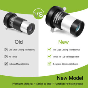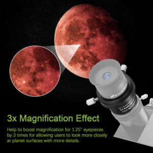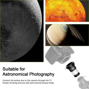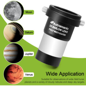 Esta barra Antares de alto desempenho triplica a potência de qualquer ocular inserida. Ele apresenta um design acromático totalmente multirrevestido. Esta barra curta funciona em diagonais ou refletores, tem lentes internas de escurecimento e escurecimento de bordas e é parfocal com a maioria das oculares. Adequado para aplicações de alto contraste e alta potência em qualquer telescópio. Triplica a potência de qualquer ocular de 1,25" sem adicionar uma extensão muito longa entre o telescópio e a ocular. Insira-o primeiro no porta-ocular ou na diagonal do telescópio e, em seguida, insira sua ocular no Barlow. Compatível com praticamente qualquer telescópio que usa oculares de 1,25", independentemente da marca, e até mesmo com alcance de foco limitado. – Aumento de 3x na ampliação: nitidez e correção de cores superiores; componentes ópticos; ampliação real da computação física – Ela não apenas aumenta a ampliação; a imagem ficará mais nítida do que o aumento médio na ampliação de até 15 vezes a clareza da imagem – Premium Barlow: as câmeras Bayonet SLR podem ser conectadas para aumentar os múltiplos da câmera para tirar fotos – Essencialmente, o triplo da potência de qualquer telescópio de 1,25 polegadas ocular com lente Barlow universal; adequada para aplicações de alto contraste e alta potência em qualquer telescópio – Compatível com a maioria das oculares telescópicas de 1,25 polegadas de diâmetro; filtros de telescópio; câmera DSLR e outros acessórios do tipo rosca T