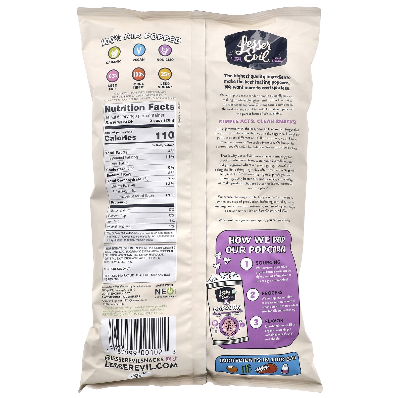 É por isso que a LesserEvil faz lanches: lanches incrivelmente saborosos feitos com ingredientes puros e sustentáveis para que você se encontre em qualquer lugar. Para nós, o que fazemos trata-se de fazer as pequenas coisas bem feitas, dia após dia, o que chamamos de Atos Simples. Por meio de fontes orgânicas, processamento mínimo, óleos melhores e práticas de sustentabilidade, fabricamos produtos que são melhores para nossos consumidores e para o planeta.
