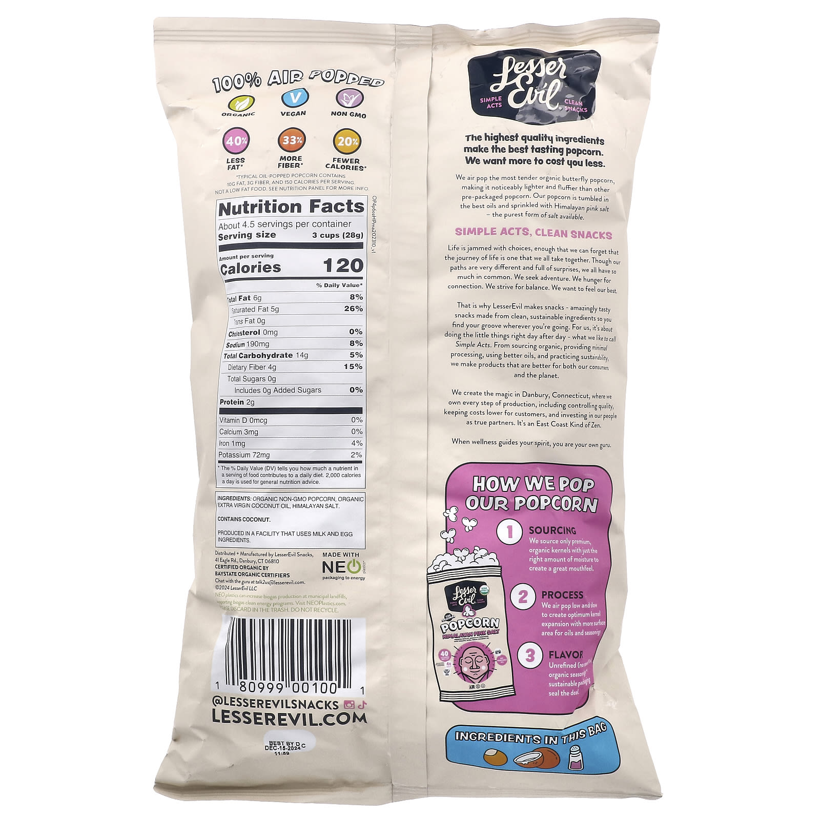 É por isso que a LesserEvil faz lanches: lanches incrivelmente saborosos feitos com ingredientes puros e sustentáveis para que você se encontre em qualquer lugar. Para nós, o que fazemos trata-se de fazer as pequenas coisas bem feitas, dia após dia, o que chamamos de Atos Simples. Por meio de fontes orgânicas, processamento mínimo, óleos melhores e práticas de sustentabilidade, fabricamos produtos que são melhores para nossos consumidores e para o planeta.