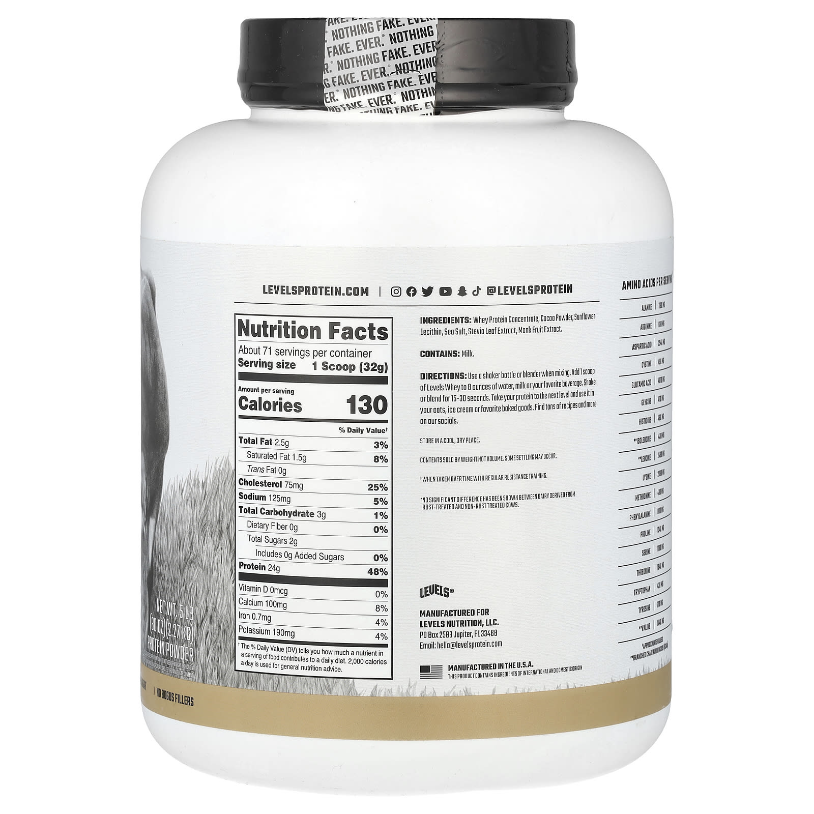 O leite de qualidade tem um sabor melhor, muito melhor. É por isso que escolhemos laticínios provenientes de gado criado no pasto e sem hormônios^ para fazer nosso concentrado de proteína whey. O concentrado de whey é a forma menos processada de whey, o que significa que é repleto de proteína completa de alta qualidade e aminoácidos essenciais. Cada lote de Levels® Whey é microfiltrado por processo a frio e misturado com lecitina de girassol para proporcionar essa mistura sem esforço que você espera. Você também não encontrará decepção aqui. Isso significa que sem soja, sem glúten e sem sabores ou adoçantes artificiais.